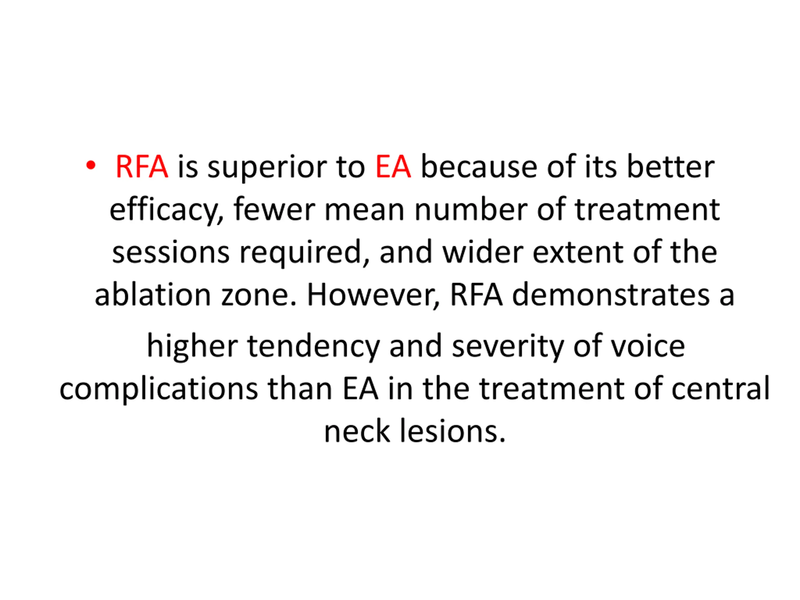 RFA is superior to EA because of its better efficacy, fewer mean number of treatment sessions required, and wider extent of the ablation zone. However, RFA demonstrates a higher tendency and severity of voice complications than EA in the treatment of central neck lesions.