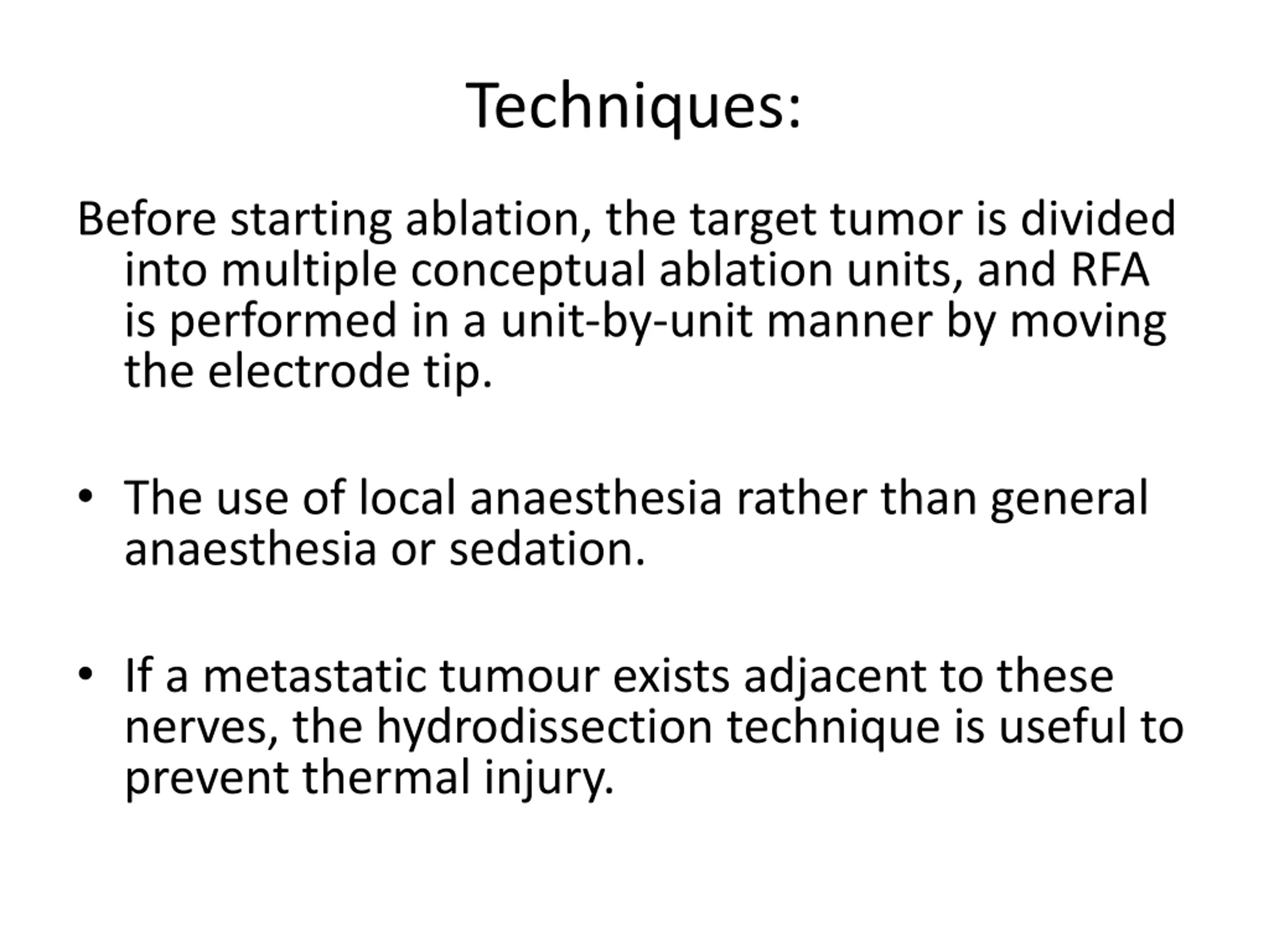 Techniques: Before starting ablation, the target tumor is divided into multiple conceptual ablation units, and RFA is performed in a unit-by-unit manner by moving the electrode tip. The use of local anaesthesia rather than general anaesthesia or sedation. If a metastatic tumour exists adjacent to these nerves, the hydrodissection technique is useful to prevent thermal injury.