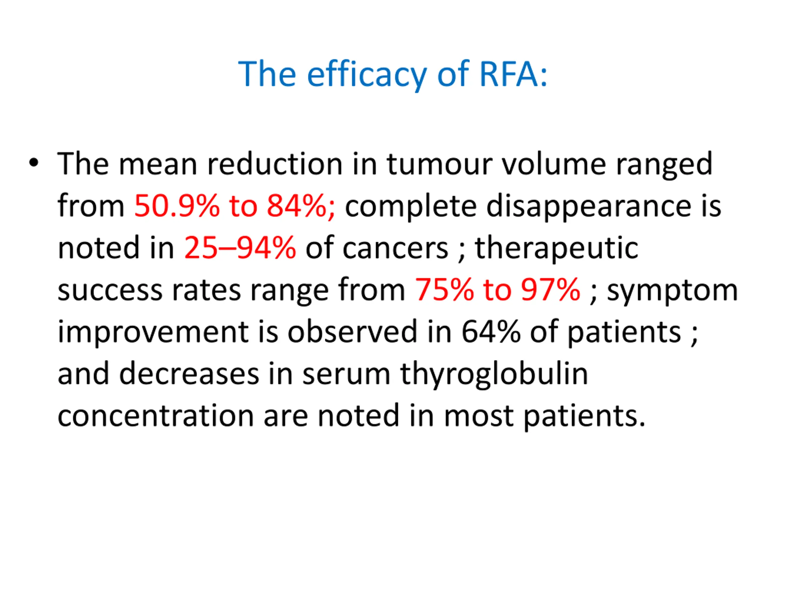 The efficacy of RFA: The mean reduction in tumour volume ranged from 50.9% to 84%; complete disappearance is noted in 25 94% of cancers ; therapeutic success rates range from 75% to 97% ; symptom improvement is observed in 64% of patients ; and decreases in serum thyroglobulin concentration are noted in most patients.