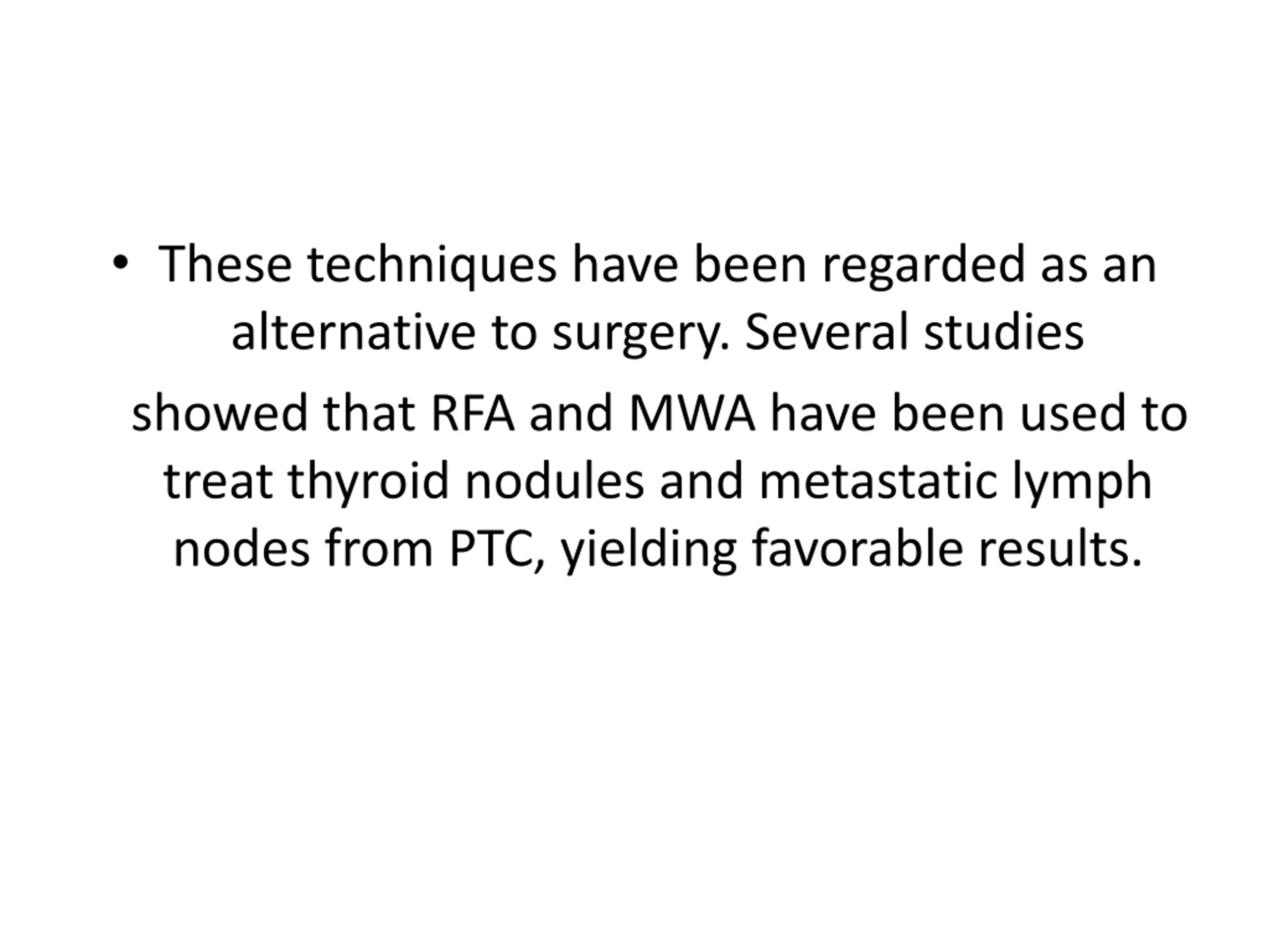 These techniques have been regarded as an alternative to surgery. Several studies showed that RFA and MWA have been used to treat thyroid nodules and metastatic lymph nodes from PTC, yielding favorable results.