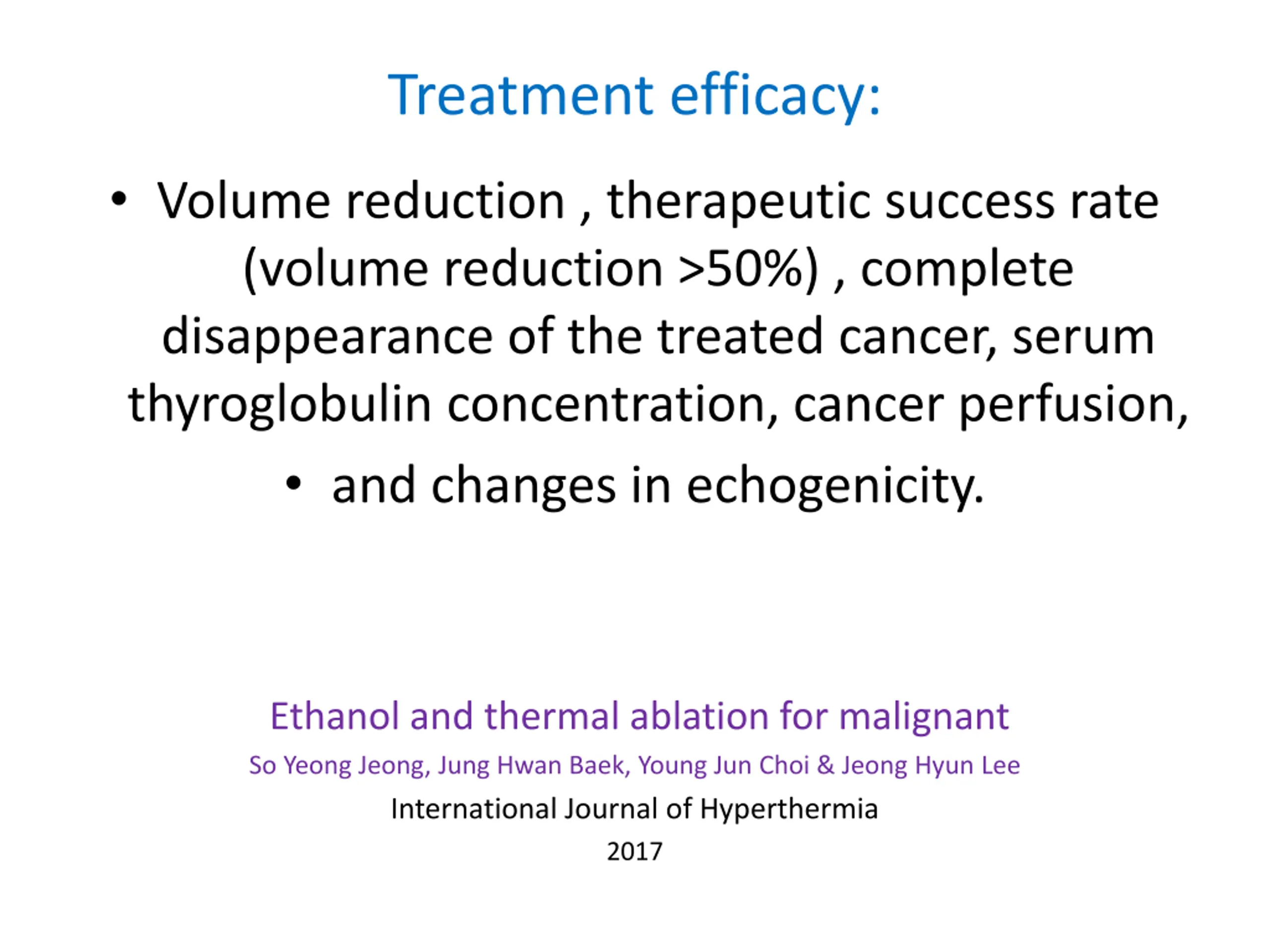 Treatment efficacy: Volume reduction , therapeutic success rate (volume reduction >50%) , complete disappearance of the treated cancer, serum thyroglobulin concentration, cancer perfusion, and changes in echogenicity. Ethanol and thermal ablation for malignant So Yeong Jeong, Jung Hwan Baek, Young Jun Choi & Jeong Hyun Lee International Journal of Hyperthermia 2017