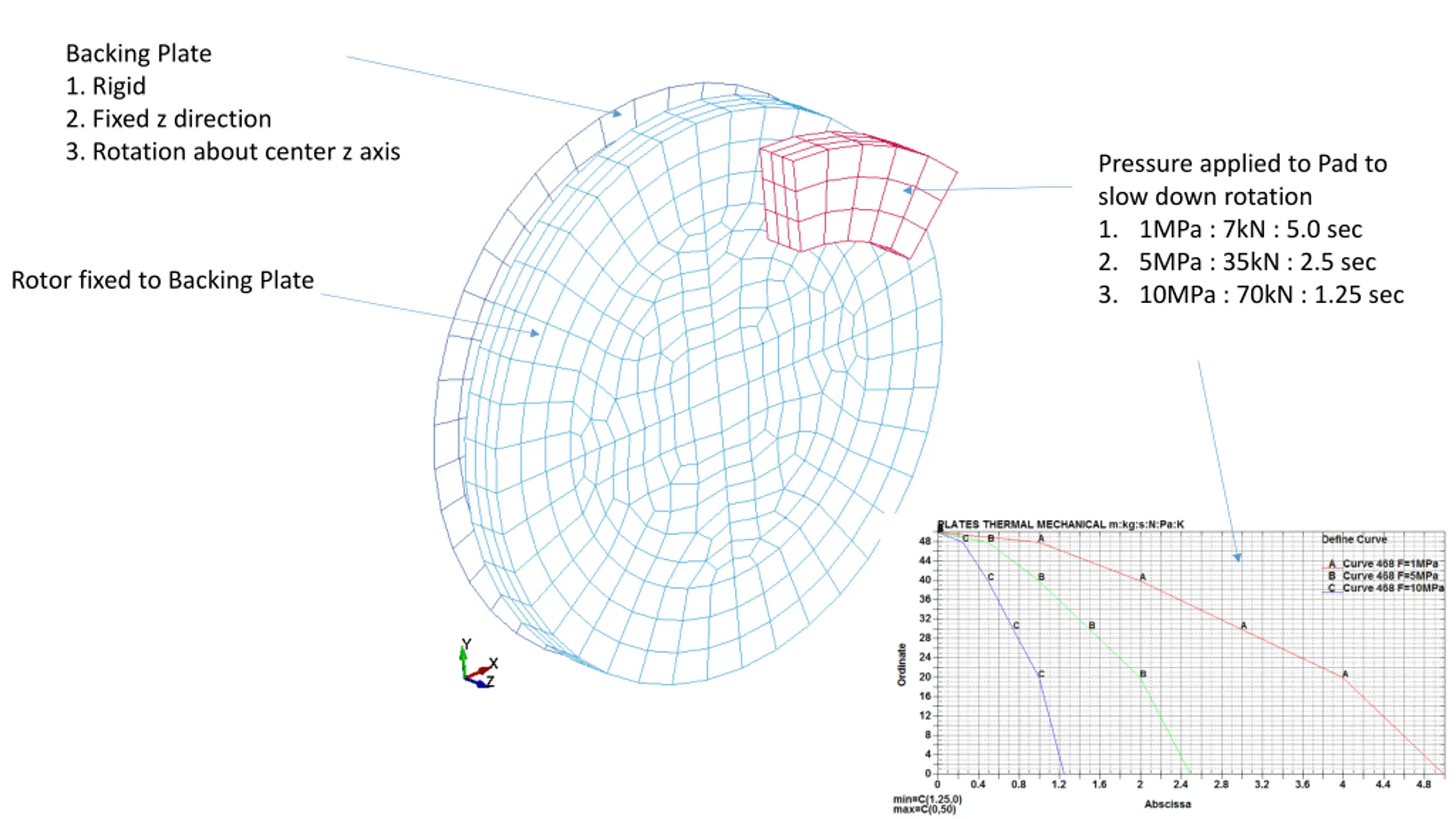 Backing Plate 1. Rigid 2. Fixed z direction 3. Rotation about center z axis Pressure applied to Pad to slow down rotation 1. 1MPa : 7kN : 5.0 sec 2. 5MPa : 35kN : 2.5 sec 3. 10MPa : 70kN : 1.25 sec Rotor fixed to Backing Plate