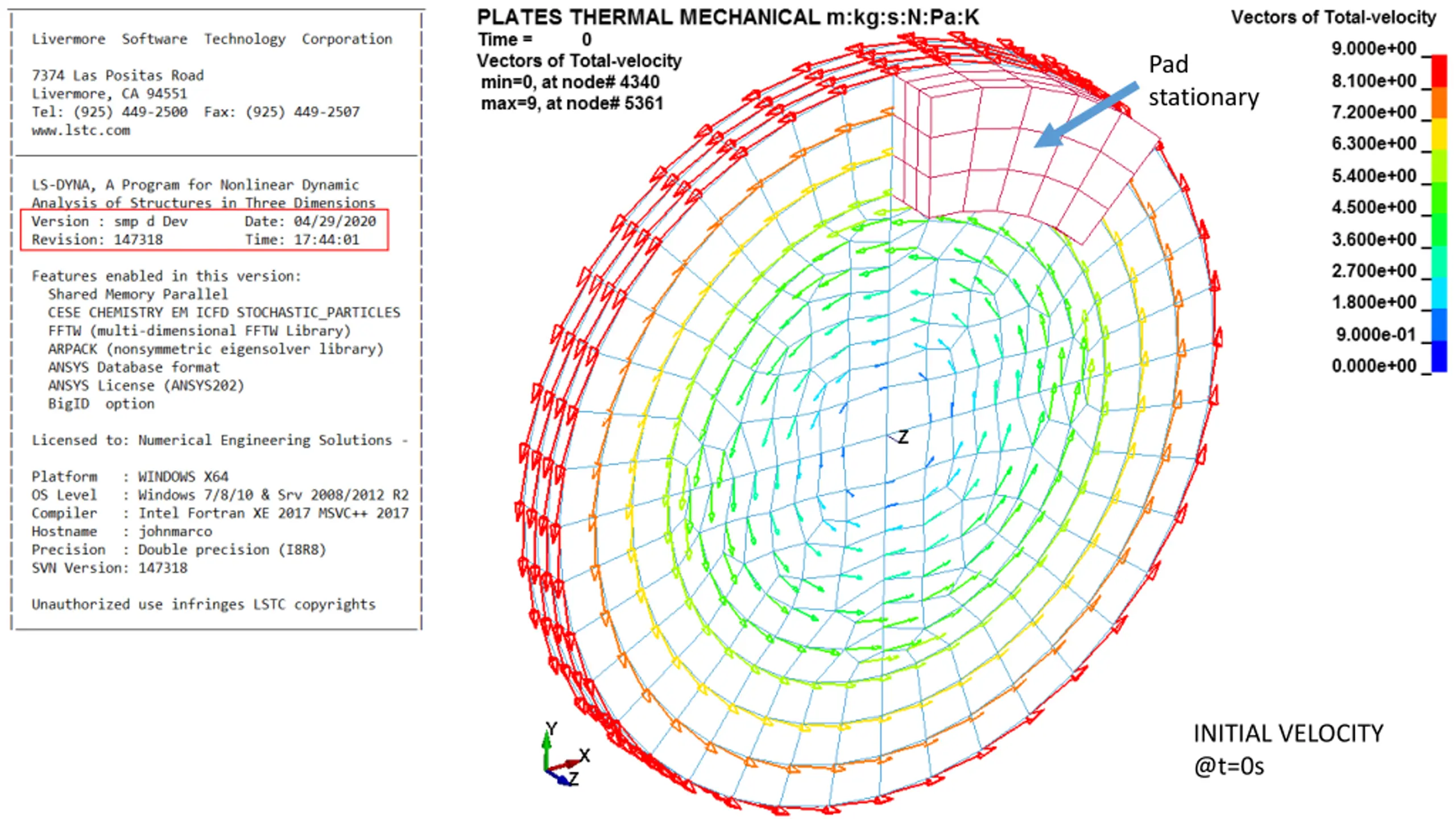 Explore the thermal behavior of a rotor-pad friction system under varying pressure scenarios. Analyze pad stationary initial velocity, backing plate rigidity, and prescribed boundary conditions affecting rotational speed. Discover solutions for mechanical and thermal control in this study of pad pressure and rotor contact.
