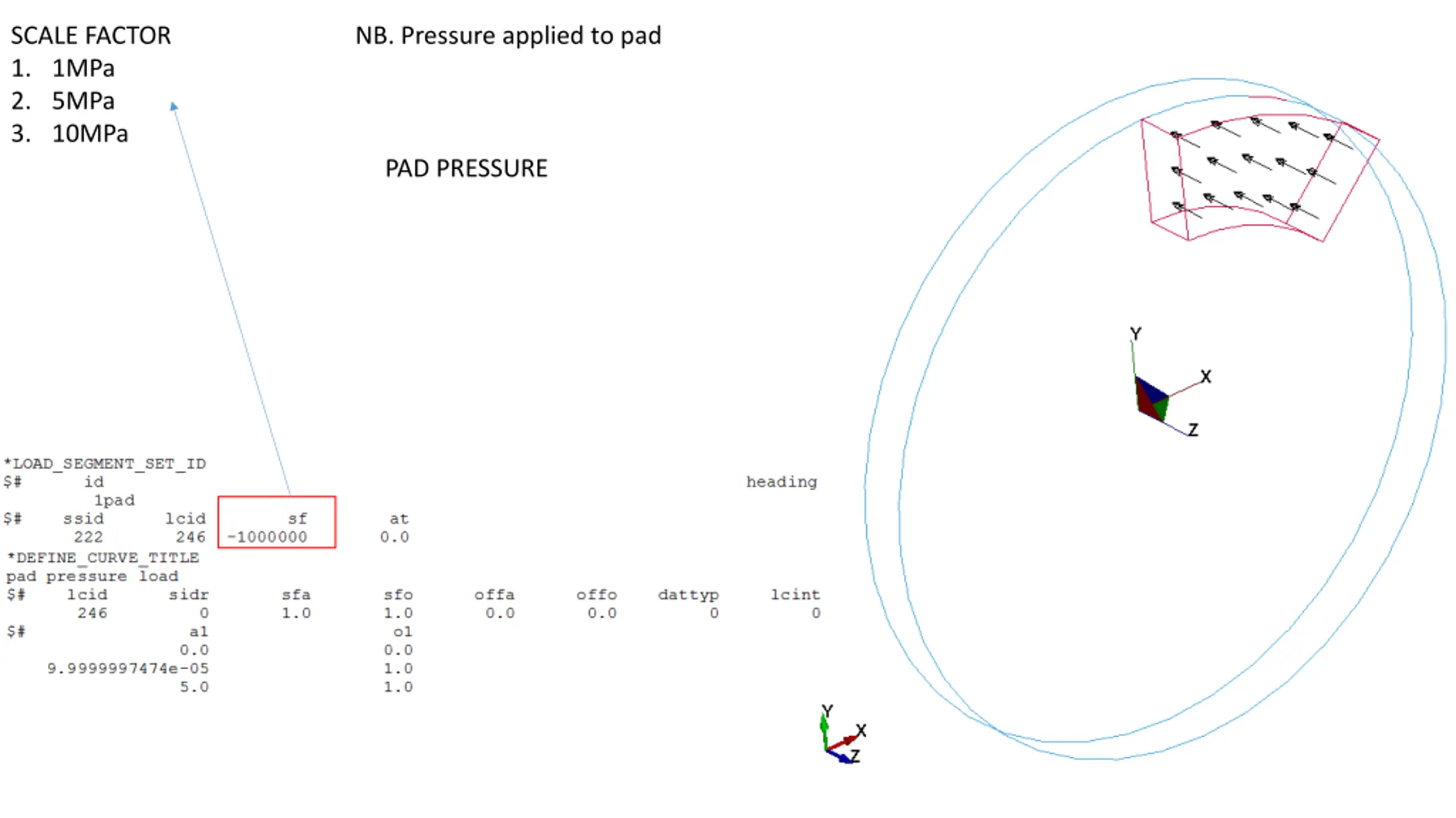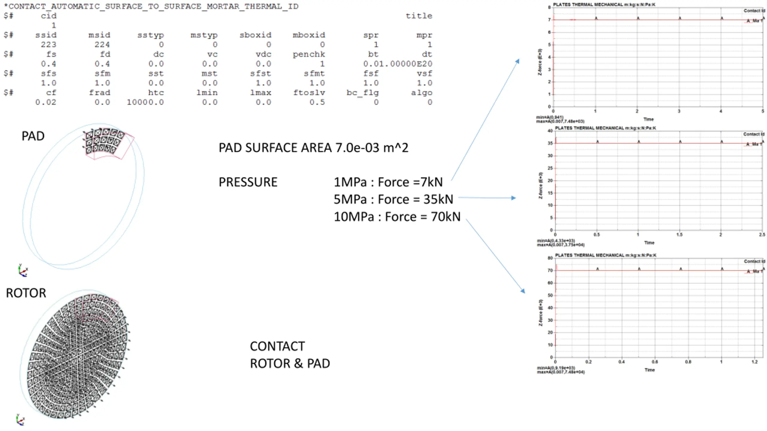 PAD PAD SURFACE AREA 7.0e-03 m^2 PRESSURE 1MPa : Force =7kN 5MPa : Force = 35kN 10MPa : Force = 70kN ROTOR CONTACT ROTOR & PAD