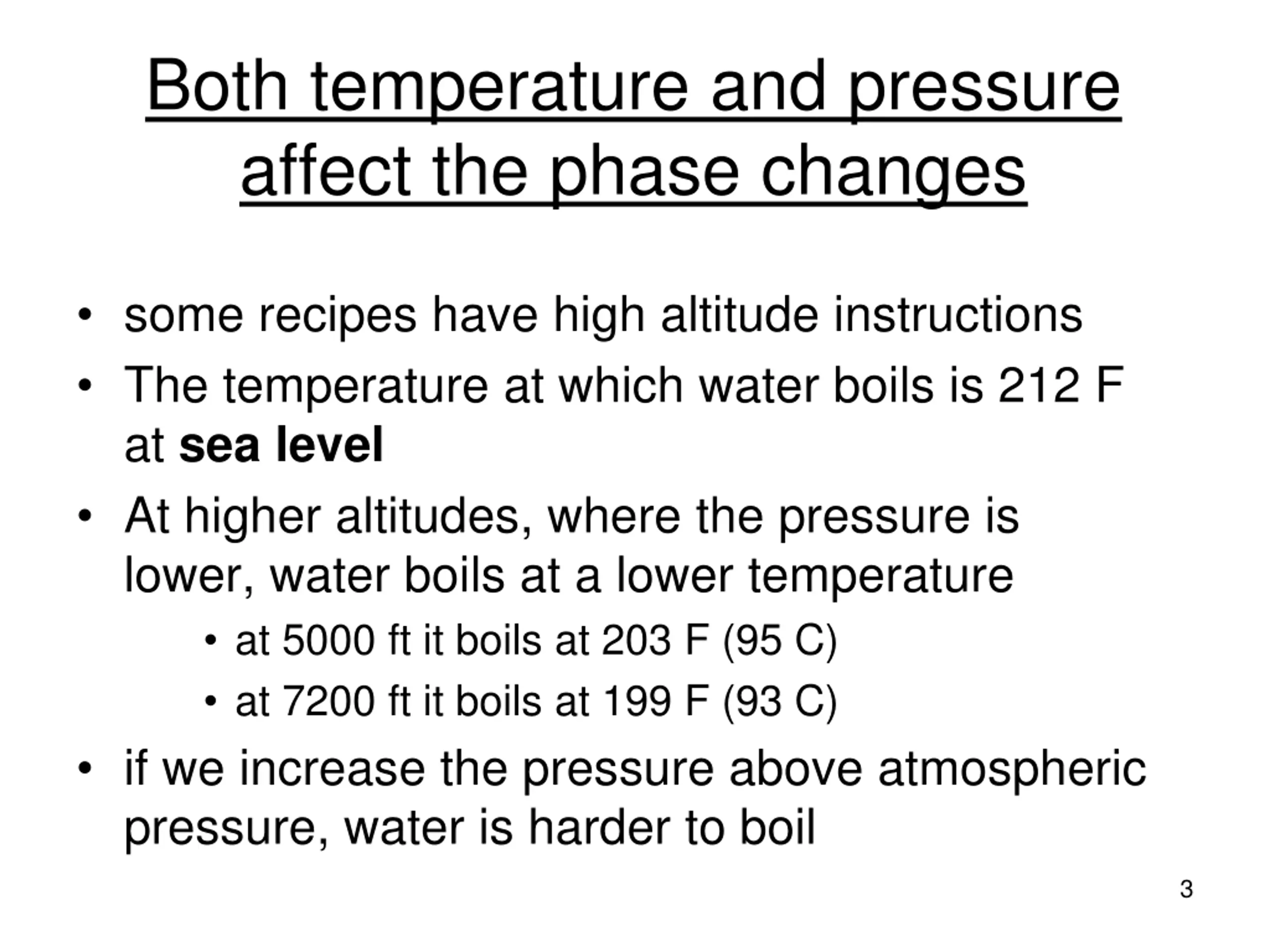 Both temperature and pressure affect the phase changes some recipes have high altitude instructions The temperature at which water boils is 212 F at sea level At higher altitudes, where the pressure is lower, water boils at a lower temperature at 5000 ft it boils at 203 F (95 C) at 7200 ft it boils at 199 F (93 C) if we increase the pressure above atmospheric pressure, water is harder to boil 3