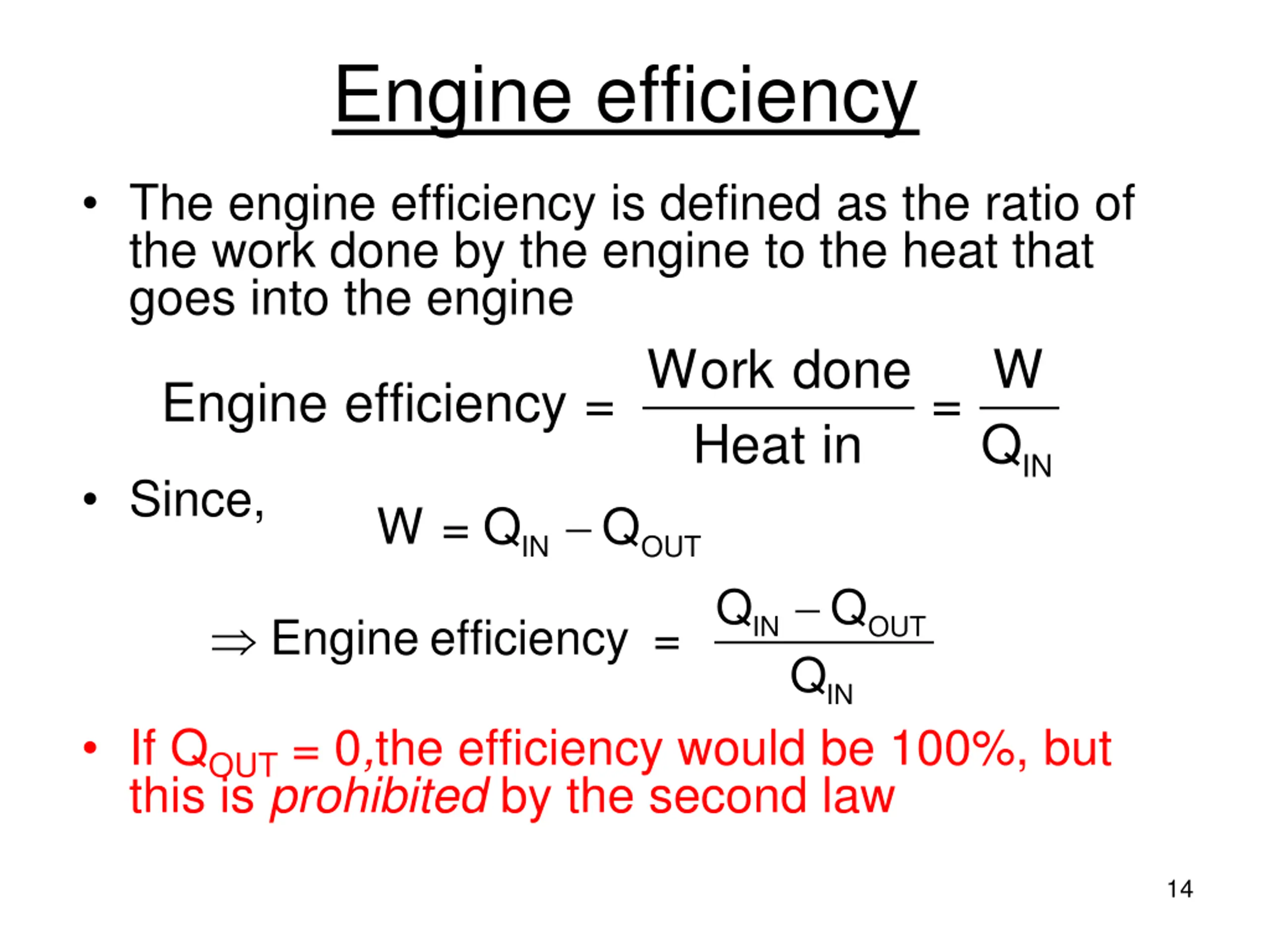 Engine efficiency The engine efficiency is defined as the ratio of the work done by the engine to the heat that goes into the engine Work done Heat in W Q Engine efficiency = = IN Since, W = Q Q IN OUT Q Q Q Engine efficiency = IN OUT IN IfQOUT = 0,the efficiency would be 100%,but this is prohibited by the second law 14