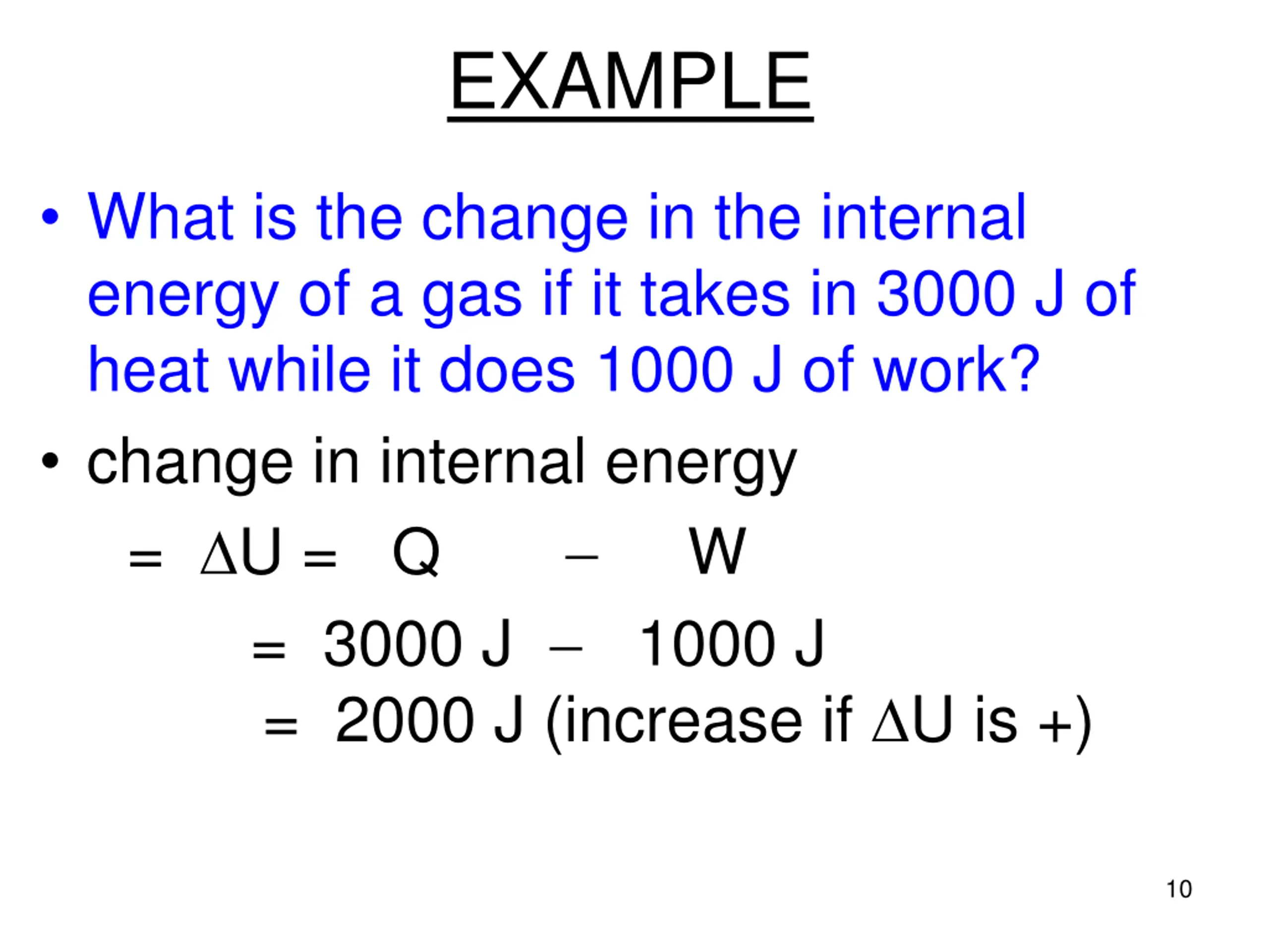 EXAMPLE What is the change in the internal energy of a gas if it takes in 3000 J of heat while it does 1000 J of work? change in internal energy = U = Q W = 3000 J 1000 J = 2000 J (increase if U is +) 10