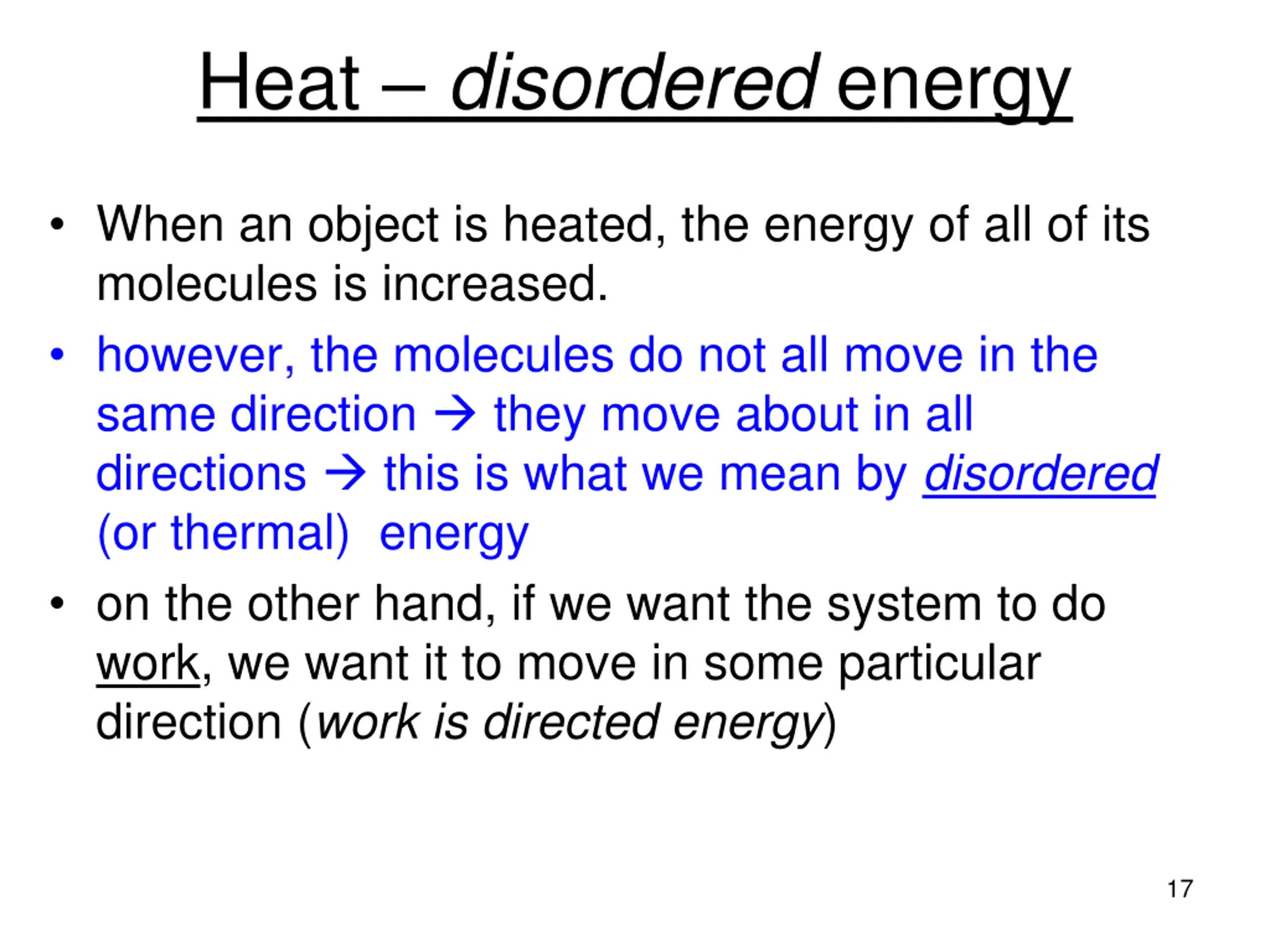 Heat disordered energy When an object is heated, the energy of all of its molecules is increased. however, the molecules do not all move in the same direction they move about in all directions this is what we mean by disordered (or thermal) energy on the other hand, if we want the system to do work, we want it to move in some particular direction (work is directed energy) 17