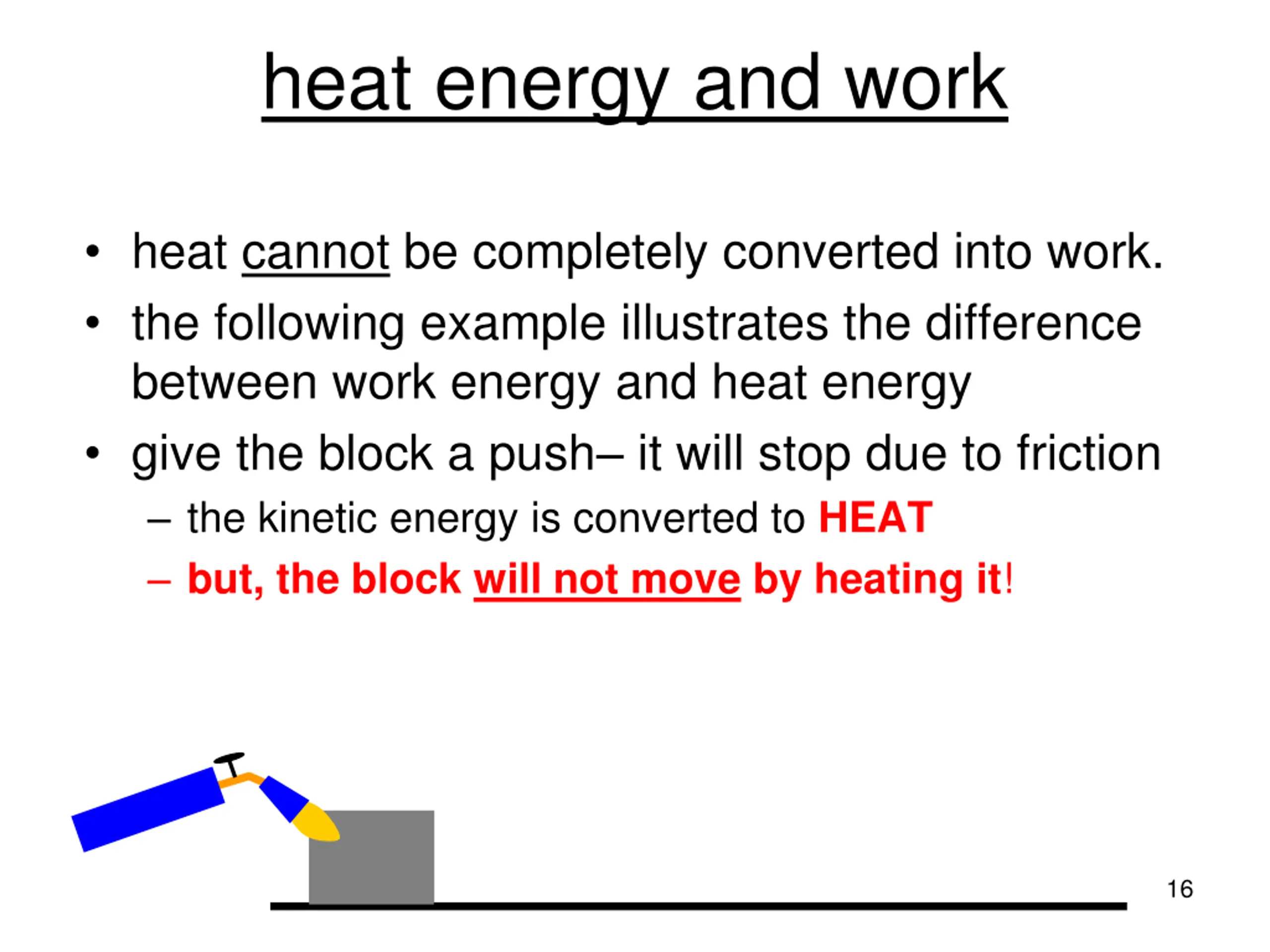 heat energy and work heat cannot be completely converted into work. the following example illustrates the difference between work energy and heat energy give the block a push it will stop due to friction the kinetic energy is converted to HEAT but, the block will not move by heating it! 16