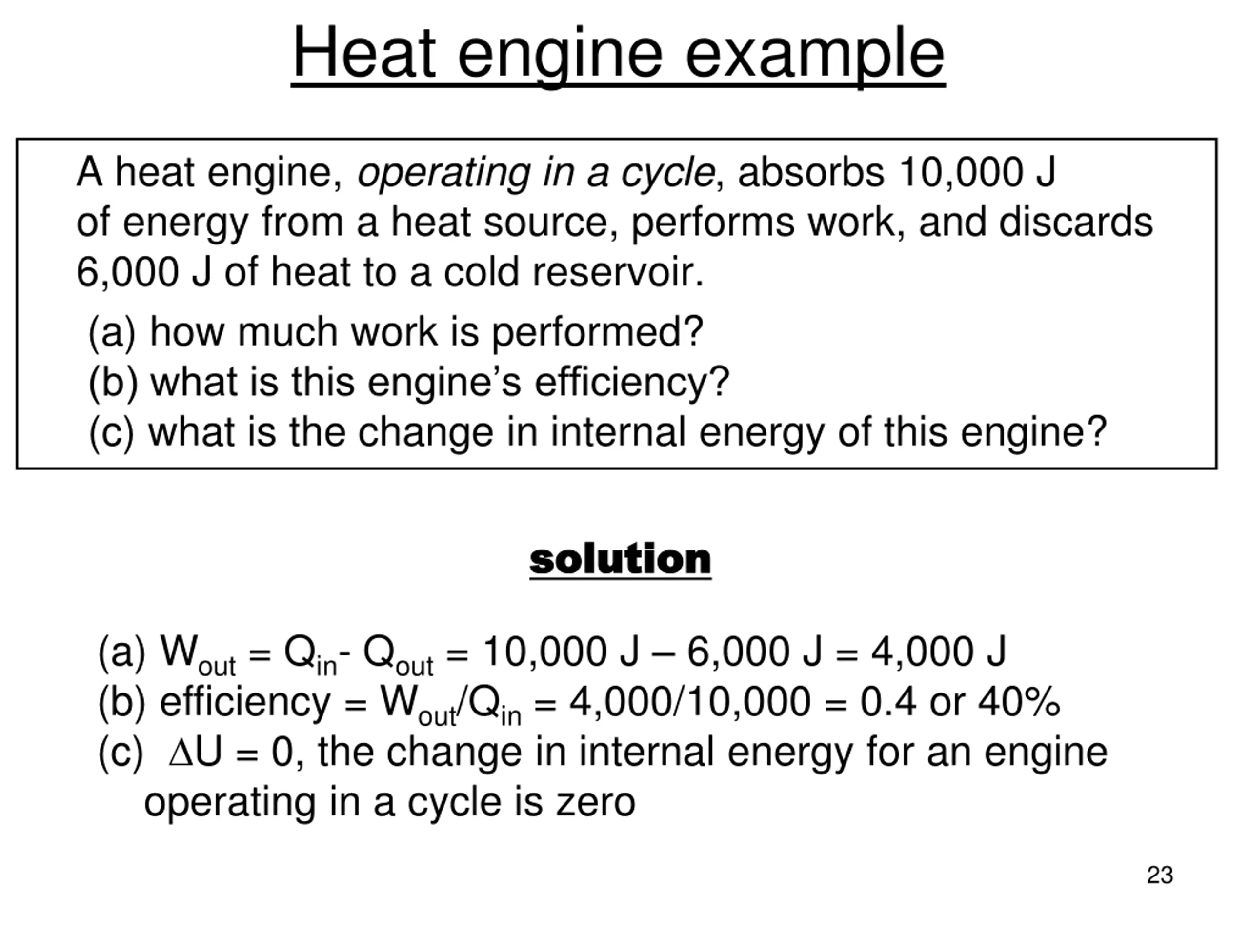 Heat engine example A heat engine, operating in a cycle, absorbs 10,000 J of energy from a heat source, performs work, and discards 6,000 J of heat to a cold reservoir. (a) how much work is performed? (b) what is this engine s efficiency? (c) what is the change in internal energy of this engine? solution solution (a) Wout = Qin- Qout = 10,000 J 6,000 J = 4,000 J (b) efficiency = Wout/Qin = 4,000/10,000 = 0.4 or 40% (c) U = 0, the change in internal energy for an engine operating in a cycle is zero 23