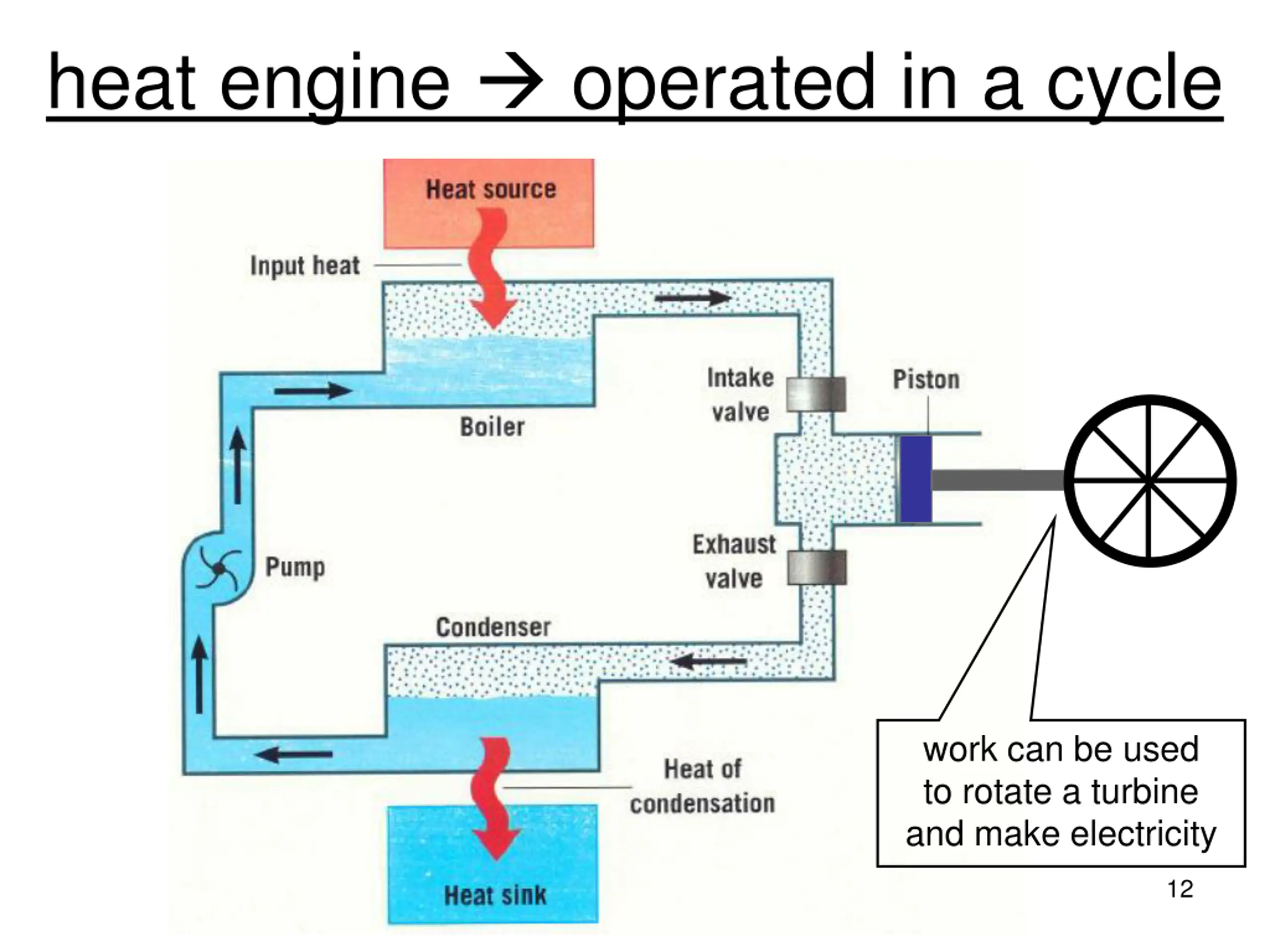 heat engine operated in a cycle work can be used to rotate a turbine and make electricity 12