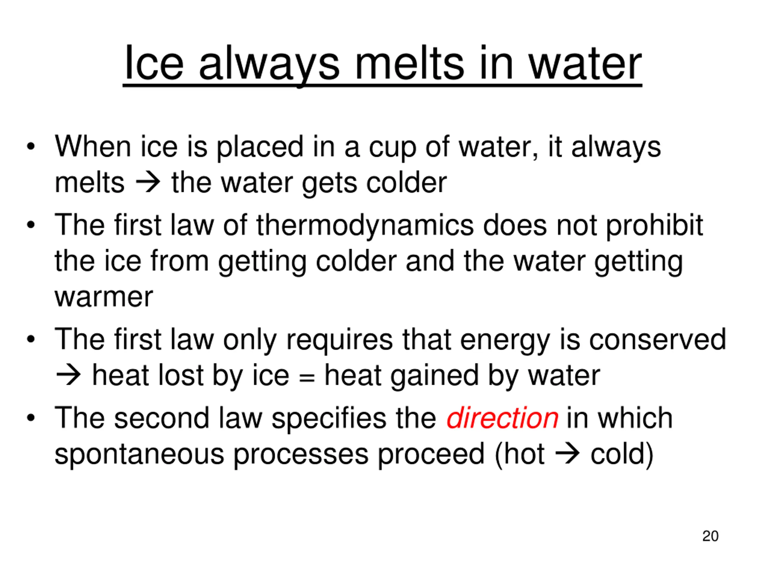 Ice always melts in water When ice is placed in a cup of water, it always melts the water gets colder The first law of thermodynamics does not prohibit the ice from getting colder and the water getting warmer The first law only requires that energy is conserved heat lost by ice = heat gained by water The second law specifies the direction in which spontaneous processes proceed (hot cold) 20