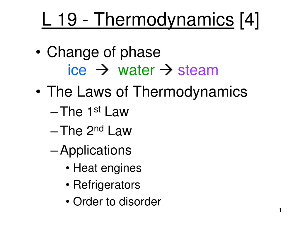 L 19 - Thermodynamics [4] Change of phase ice water steam The Laws of Thermodynamics The 1st Law The 2nd Law Applications Heat engines Refrigerators Order to disorder 1
