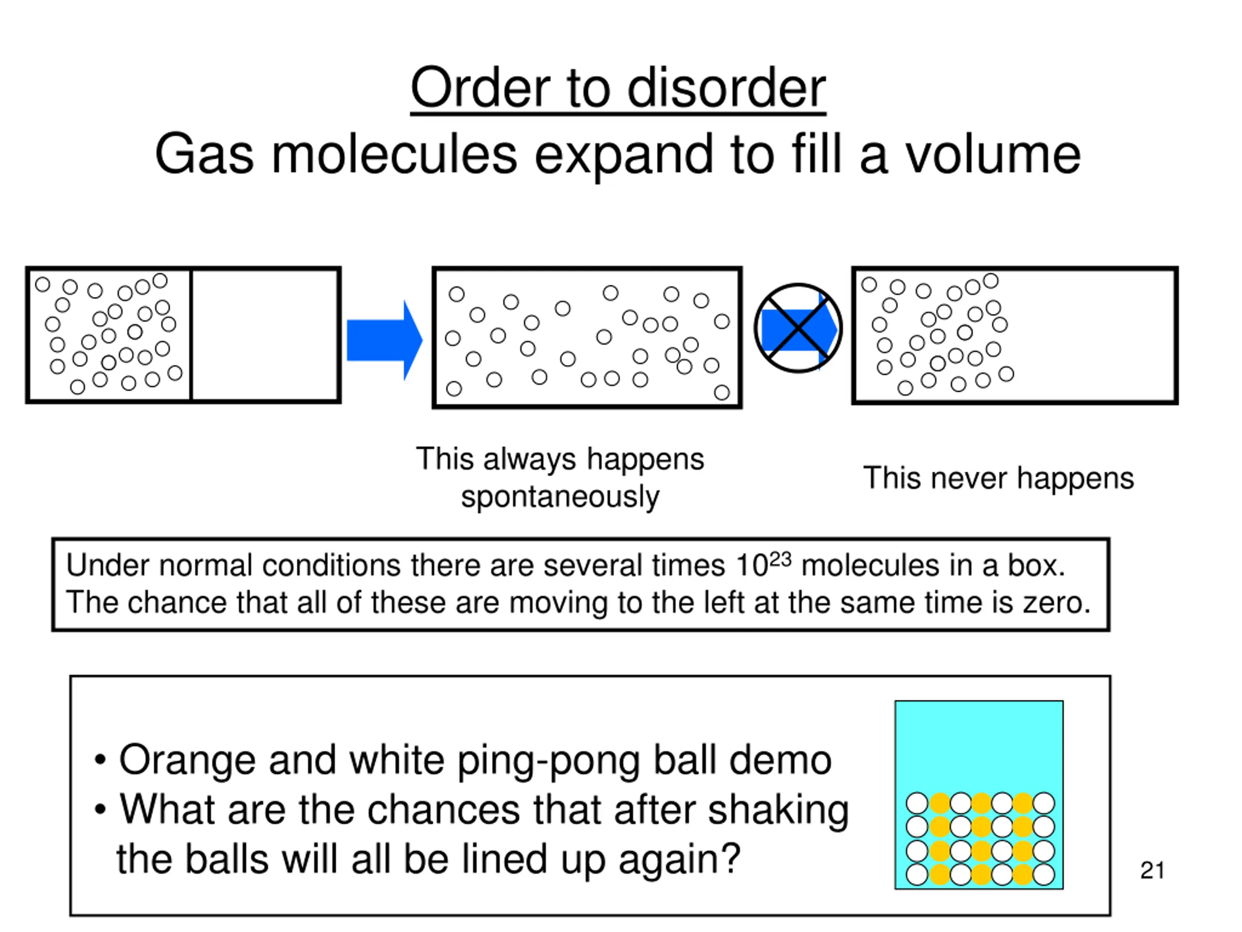 Order to disorder Gas molecules expand to fill a volume This always happens spontaneously This never happens Under normal conditions there are several times 1023 molecules in a box. The chance that all of these are moving to the left at the same time is zero. Orange and white ping-pong ball demo What are the chances that after shaking the balls will all be lined up again? 21
