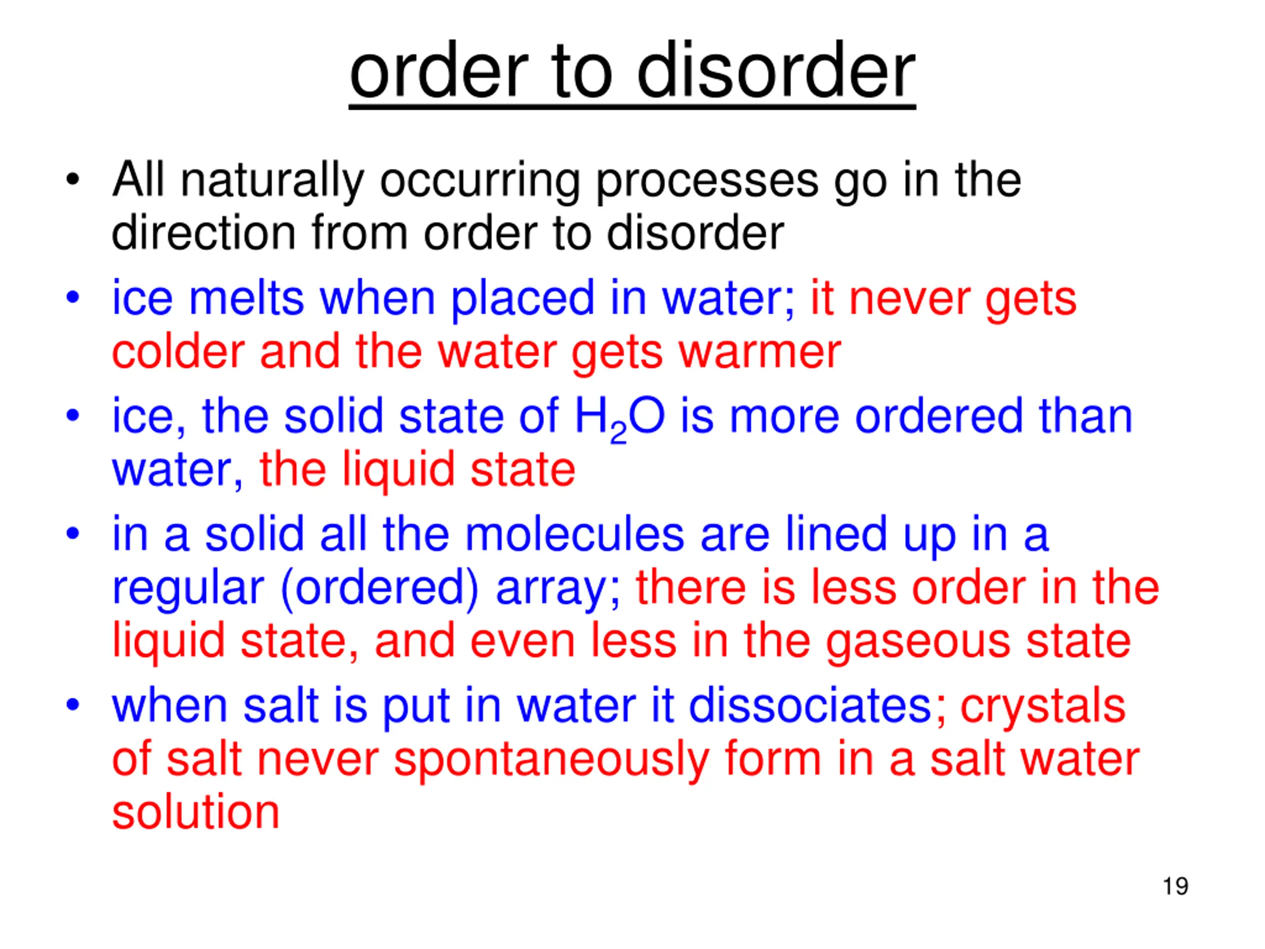 order to disorder All naturally occurring processes go in the direction from order to disorder ice melts when placed in water; it never gets colder and the water gets warmer ice, the solid state of H2O is more ordered than water, the liquid state in a solid all the molecules are lined up in a regular (ordered) array; there is less order in the liquid state, and even less in the gaseous state when salt is put in water it dissociates; crystals of salt never spontaneously form in a salt water solution 19