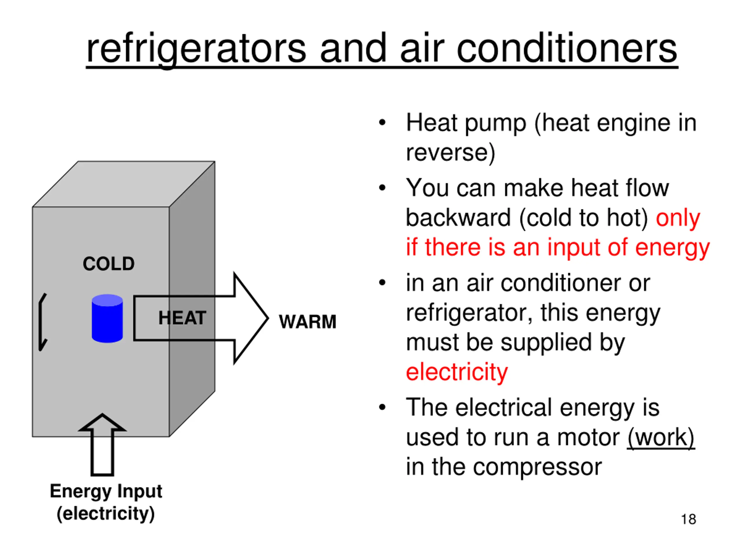 refrigerators and air conditioners Heat pump (heat engine in reverse) You can make heat flow backward (cold to hot) only if there is an input of energy in an air conditioner or refrigerator, this energy must be supplied by electricity The electrical energy is used to run a motor (work) in the compressor COLD HEAT WARM Energy Input (electricity) 18