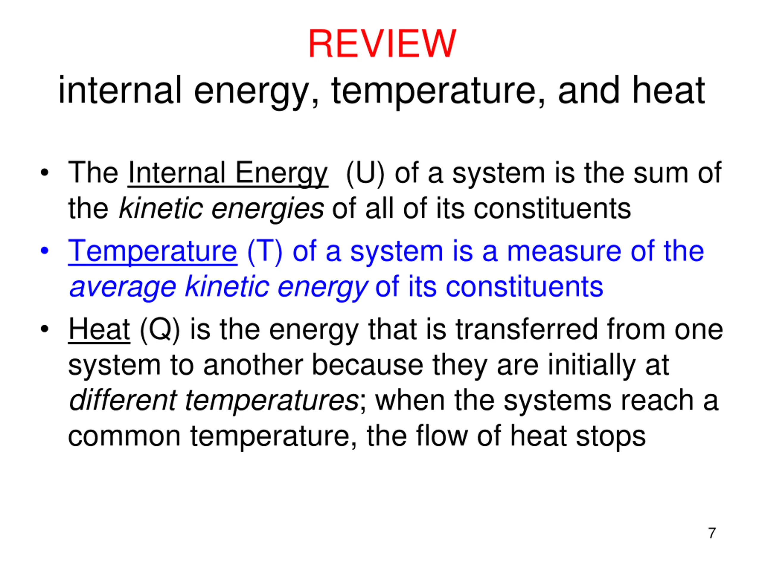 REVIEW internal energy, temperature, and heat The Internal Energy (U) of a system is the sum of the kinetic energies of all of its constituents Temperature (T) of a system is a measure of the average kinetic energy of its constituents Heat (Q) is the energy that is transferred from one system to another because they are initially at different temperatures; when the systems reach a common temperature, the flow of heat stops 7