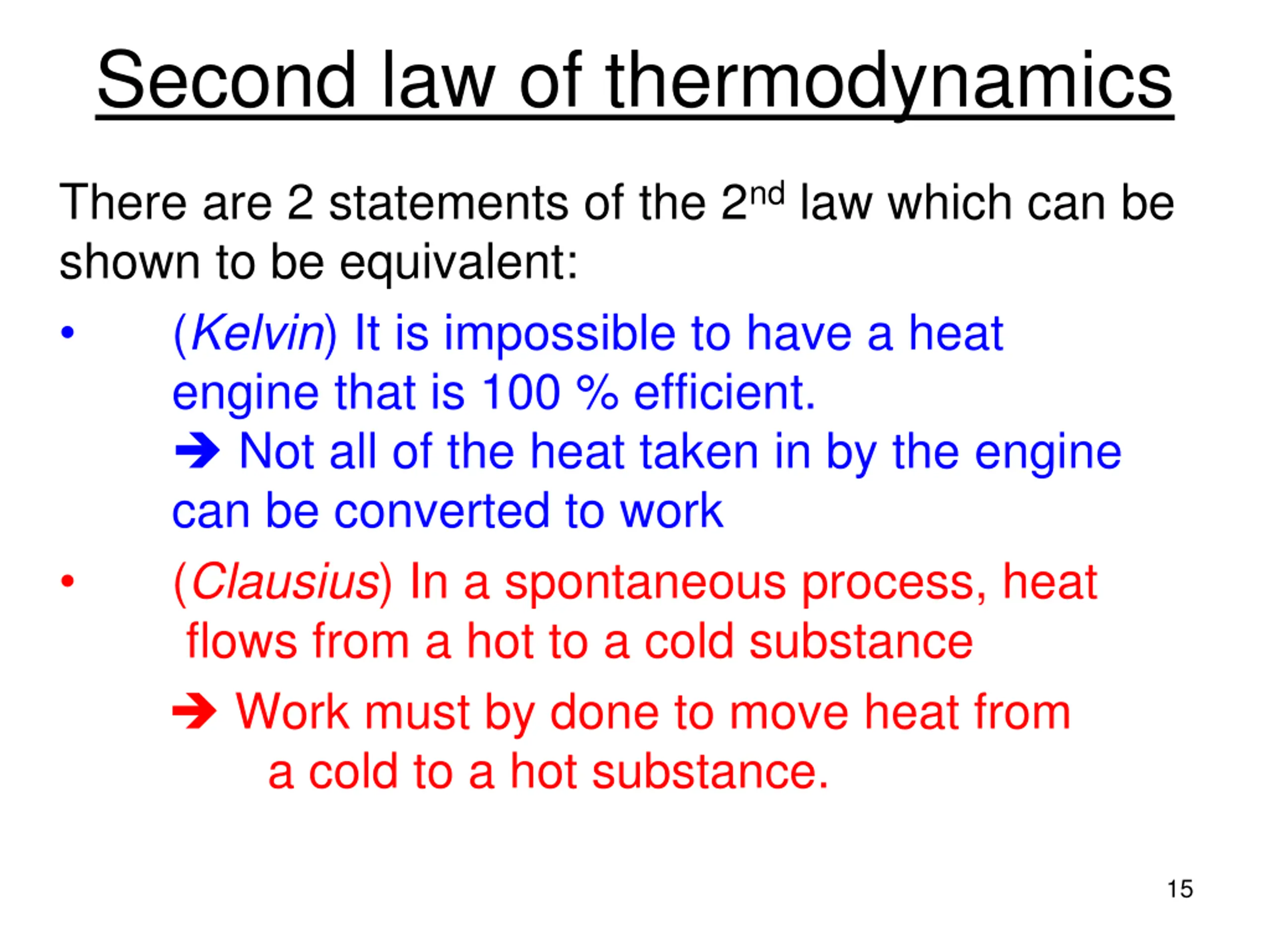 Second law of thermodynamics There are 2 statements of the 2nd law which can be shown to be equivalent: (Kelvin) It is impossible to have a heat engine that is 100 % efficient. Not all of the heat taken in by the engine can be converted to work (Clausius) In a spontaneous process, heat flows from a hot to a cold substance Work must by done to move heat from a cold to a hot substance. 15