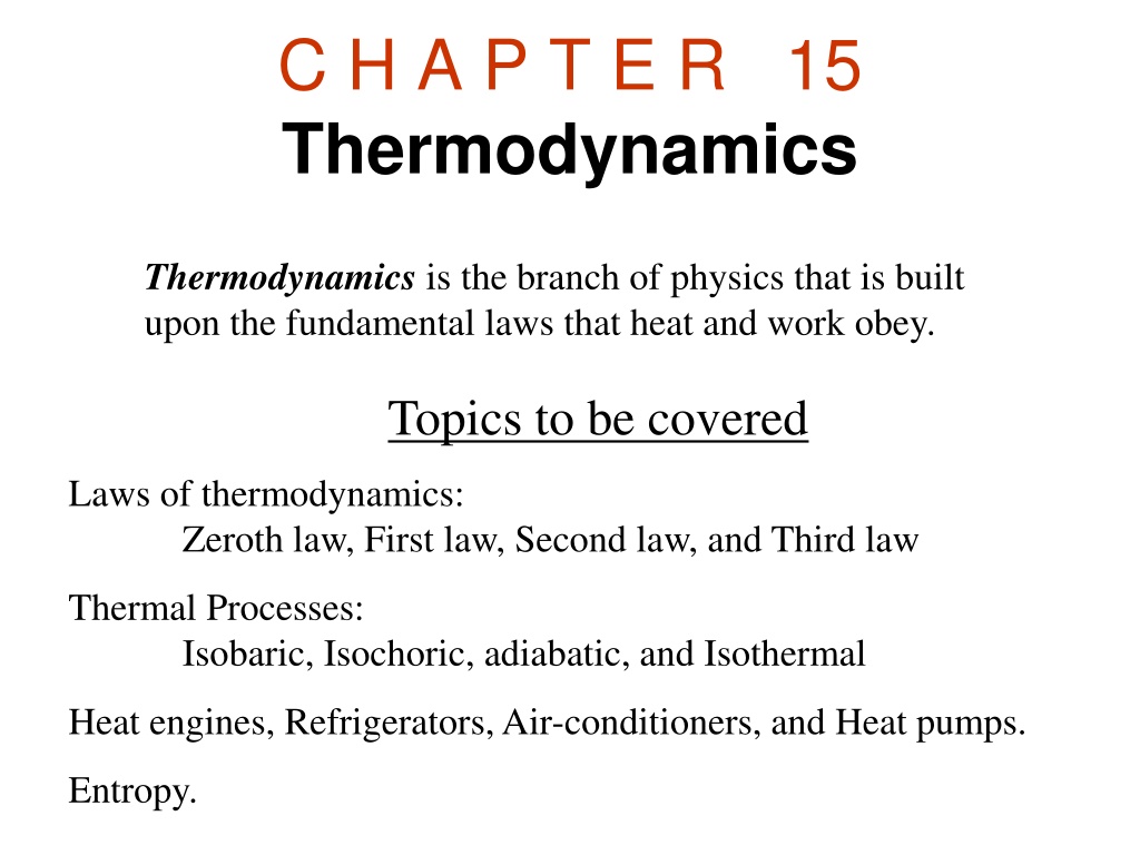 C H A P T E R 15 Thermodynamics Thermodynamics is the branch of physics that is built upon the fundamental laws that heat and work obey. Topics to be covered Laws of thermodynamics: Zeroth law, First law, Second law, and Third law Thermal Processes: Isobaric, Isochoric, adiabatic, and Isothermal Heat engines, Refrigerators, Air-conditioners, and Heat pumps. Entropy.