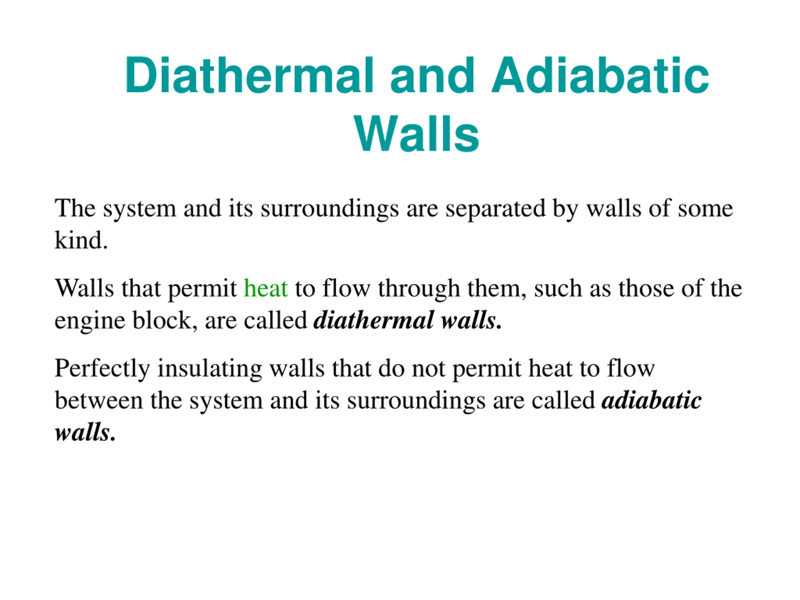 Diathermal and Adiabatic Walls The system and its surroundings are separated by walls of some kind. Walls that permit heat to flow through them, such as those of the engine block, are called diathermal walls. Perfectly insulating walls that do not permit heat to flow between the system and its surroundings are called adiabatic walls.