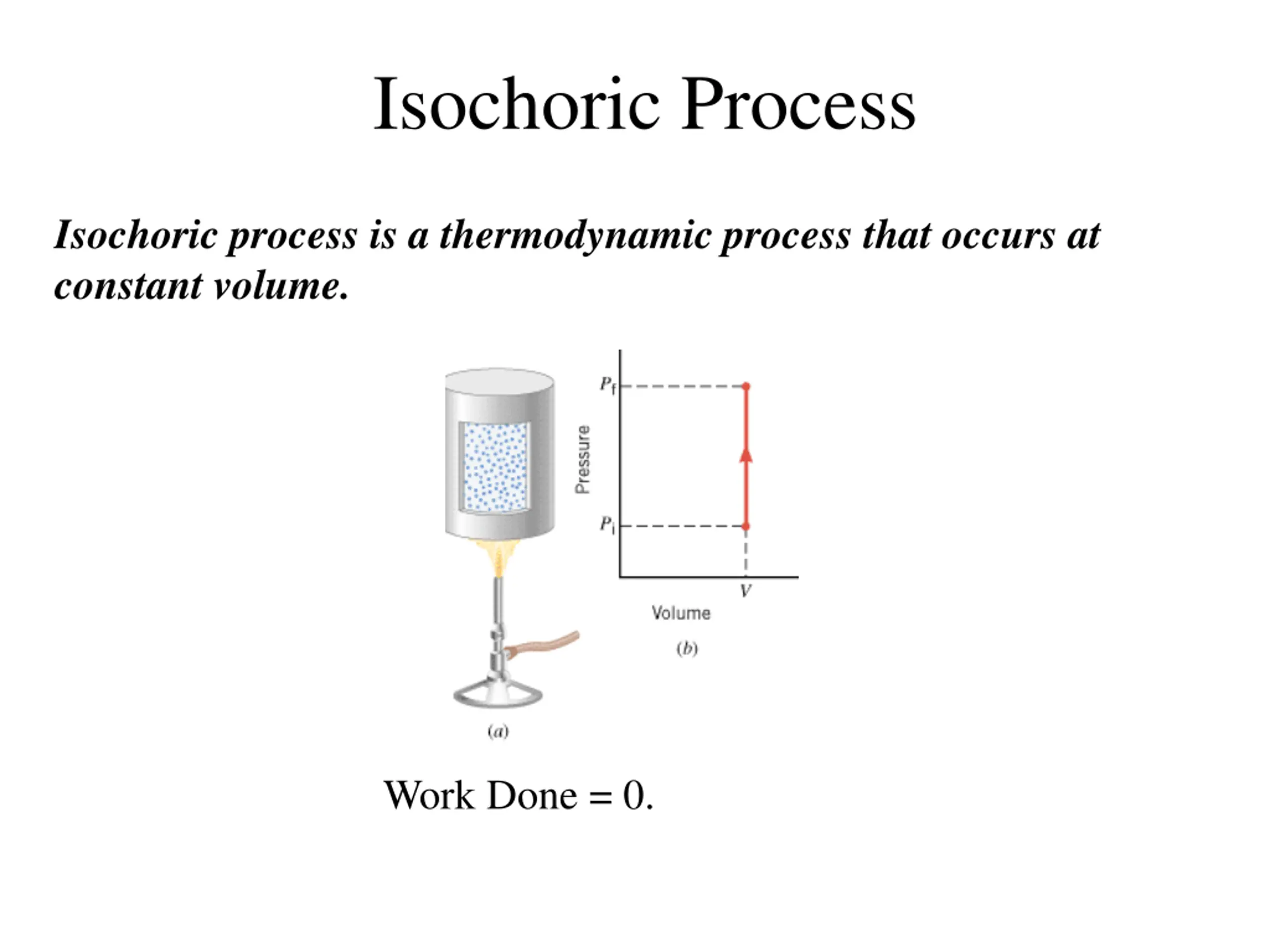 Isochoric Process Isochoric process is a thermodynamic process that occurs at constant volume. Work Done = 0.