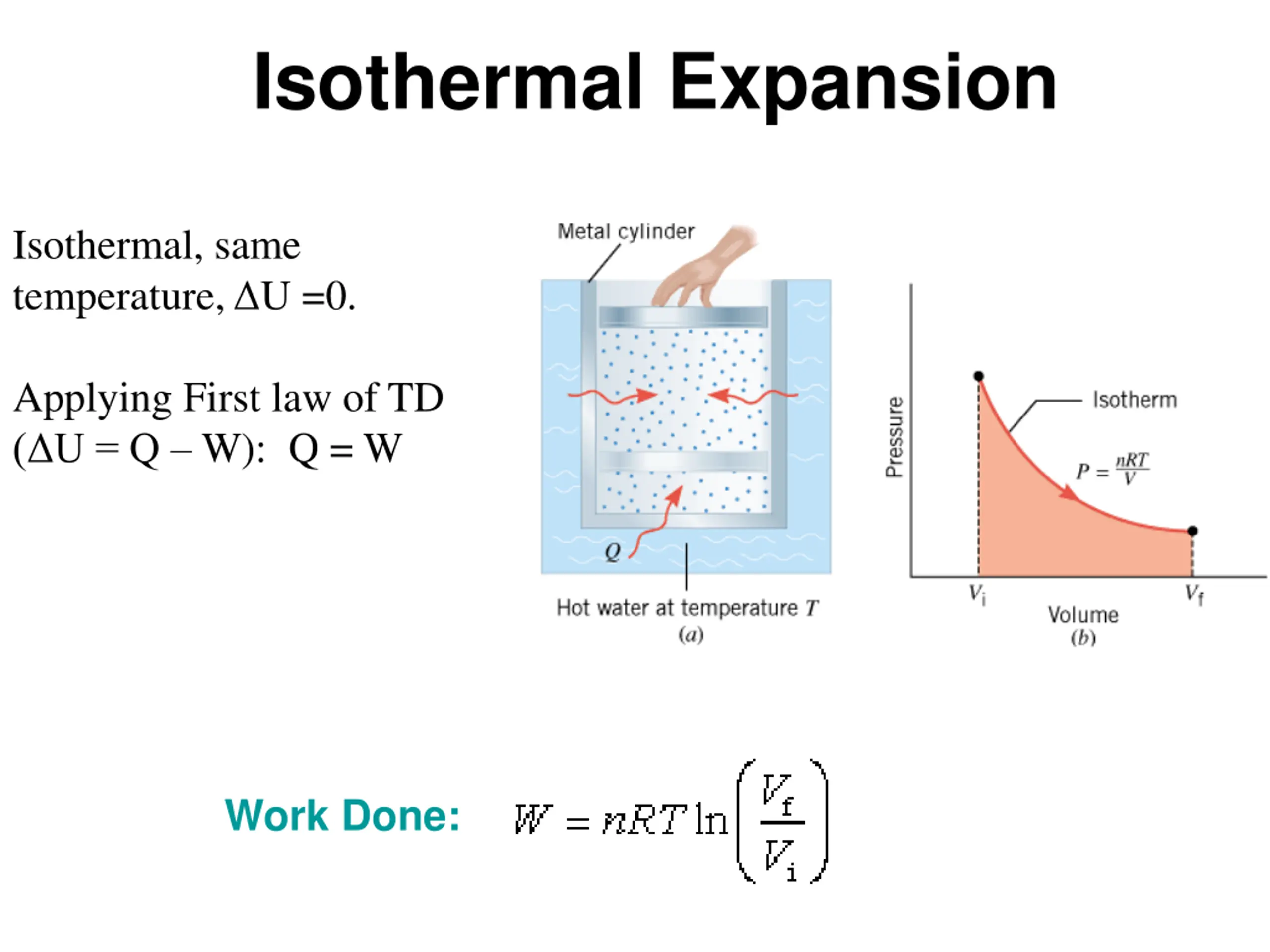 Isothermal Expansion Isothermal, same temperature, U =0. Applying First law of TD ( U = Q W): Q = W Work Done: