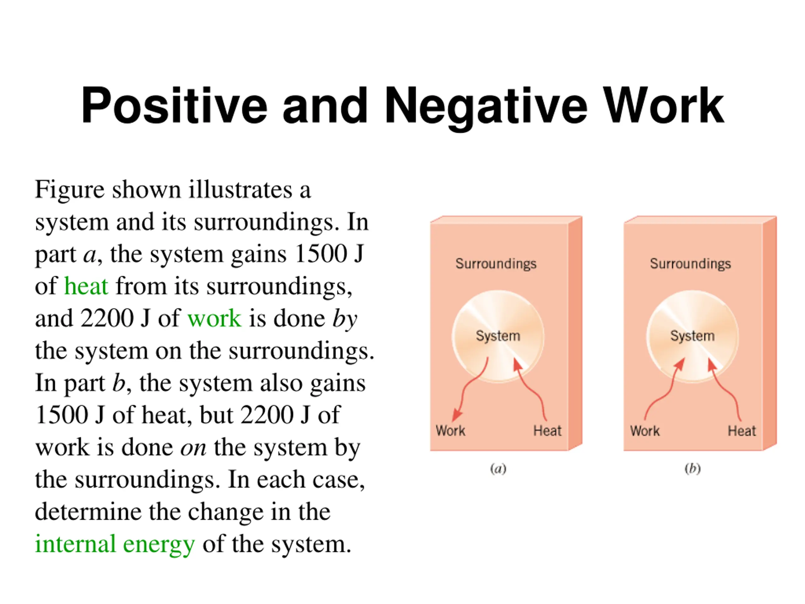 Positive and Negative Work Figure shown illustrates a system and its surroundings. In part a, the system gains 1500 J of heat from its surroundings, and 2200 J of work is done by the system on the surroundings. In part b, the system also gains 1500 J of heat, but 2200 J of work is done on the system by the surroundings. In each case, determine the change in the internal energy of the system.