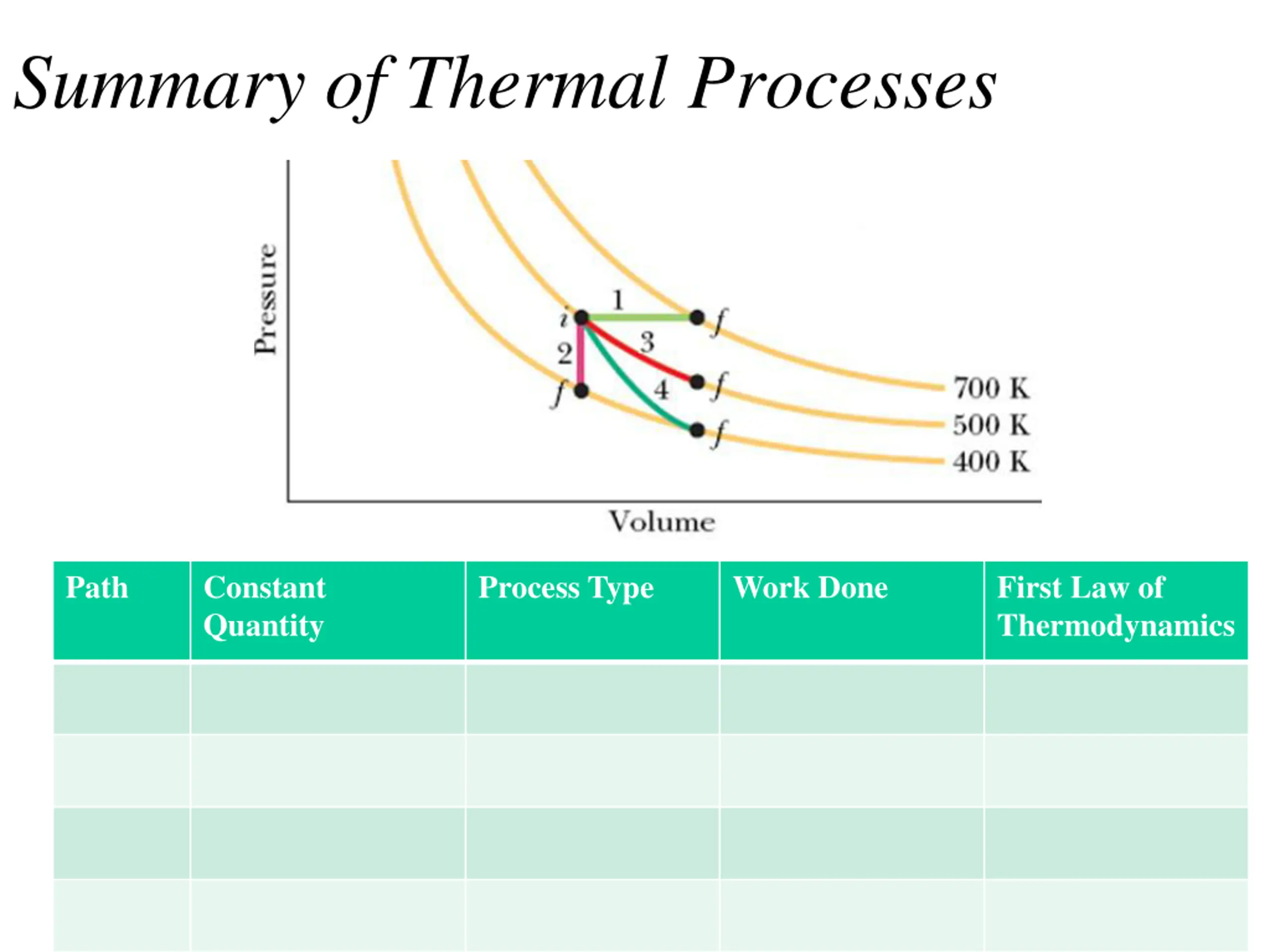 Summary of Thermal Processes Path Constant Quantity Process Type Work Done First Law of Thermodynamics