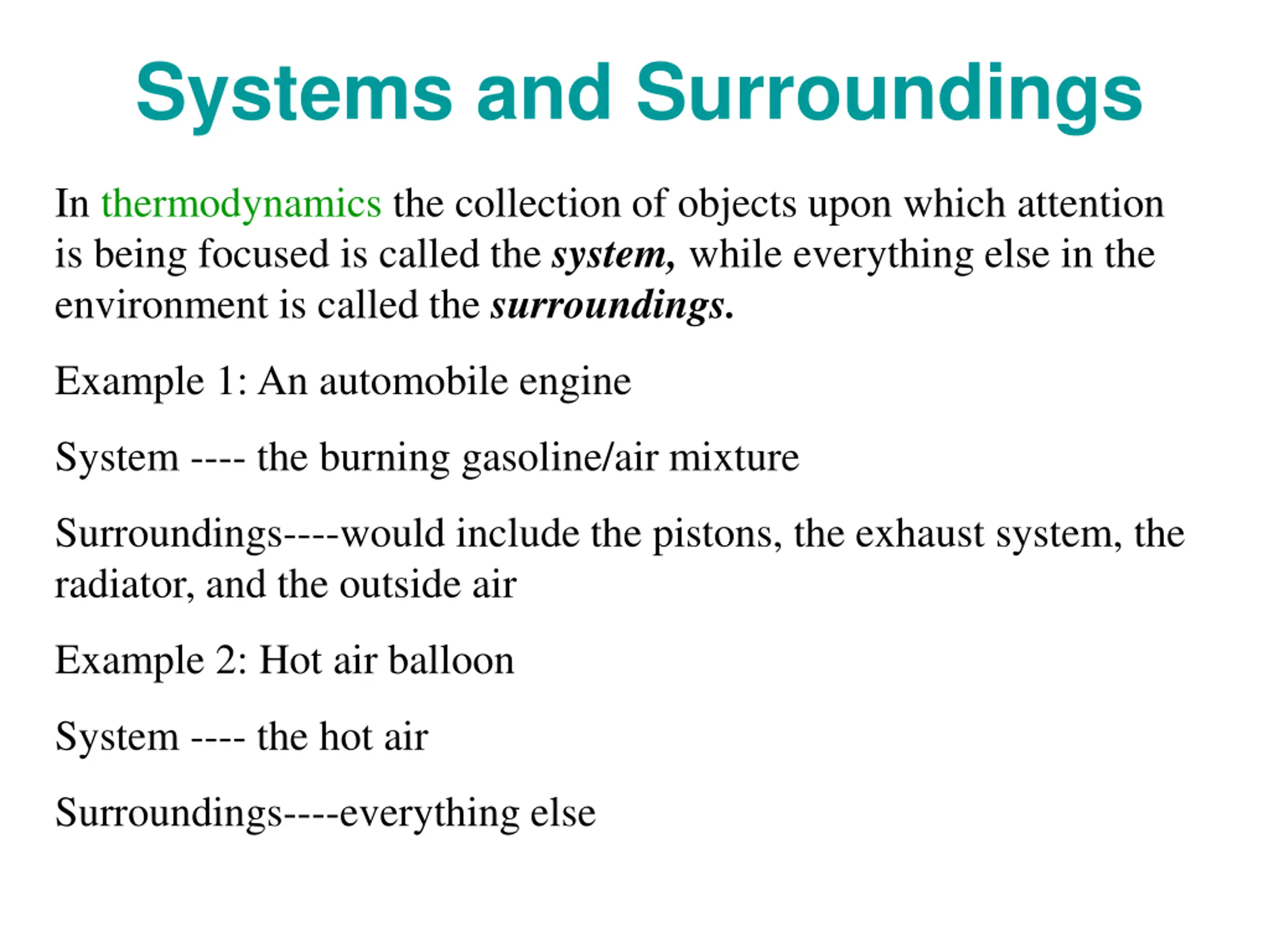 Systems and Surroundings In thermodynamics the collection of objects upon which attention is being focused is called the system, while everything else in the environment is called the surroundings. Example 1: An automobile engine System ---- the burning gasoline/air mixture Surroundings----would include the pistons, the exhaust system, the radiator, and the outside air Example 2: Hot air balloon System ---- the hot air Surroundings----everything else