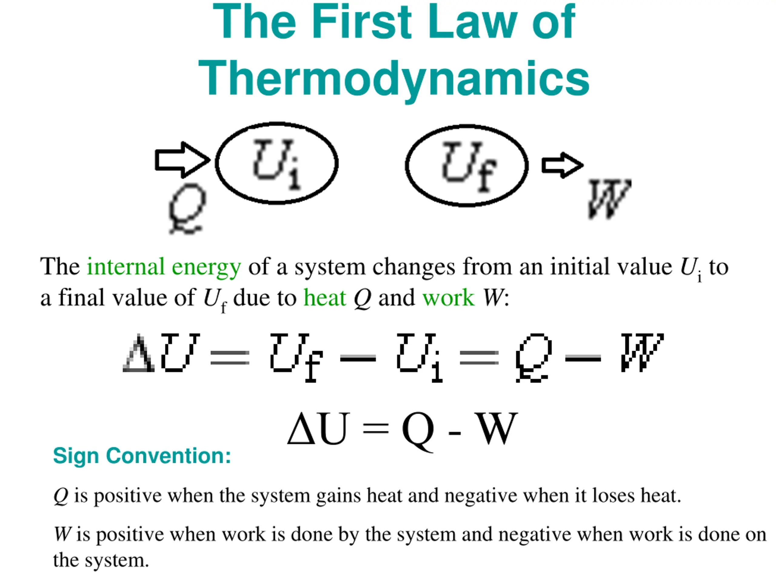 The First Law of Thermodynamics The internal energy of a system changes from an initial value Ui to a final value of Uf due to heat Q and work W: U = Q - W Sign Convention: Q is positive when the system gains heat and negative when it loses heat. W is positive when work is done by the system and negative when work is done on the system.