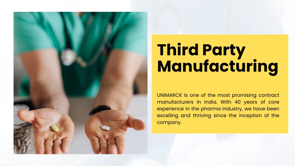 Looking for a trusted third-party manufacturing unit in India? Partner with a WHO-GMP certified facility that ensures high-quality pharmaceutical production, regulatory compliance, and timely delivery. Contact Unimarck Pharma (I) Ltd. today.