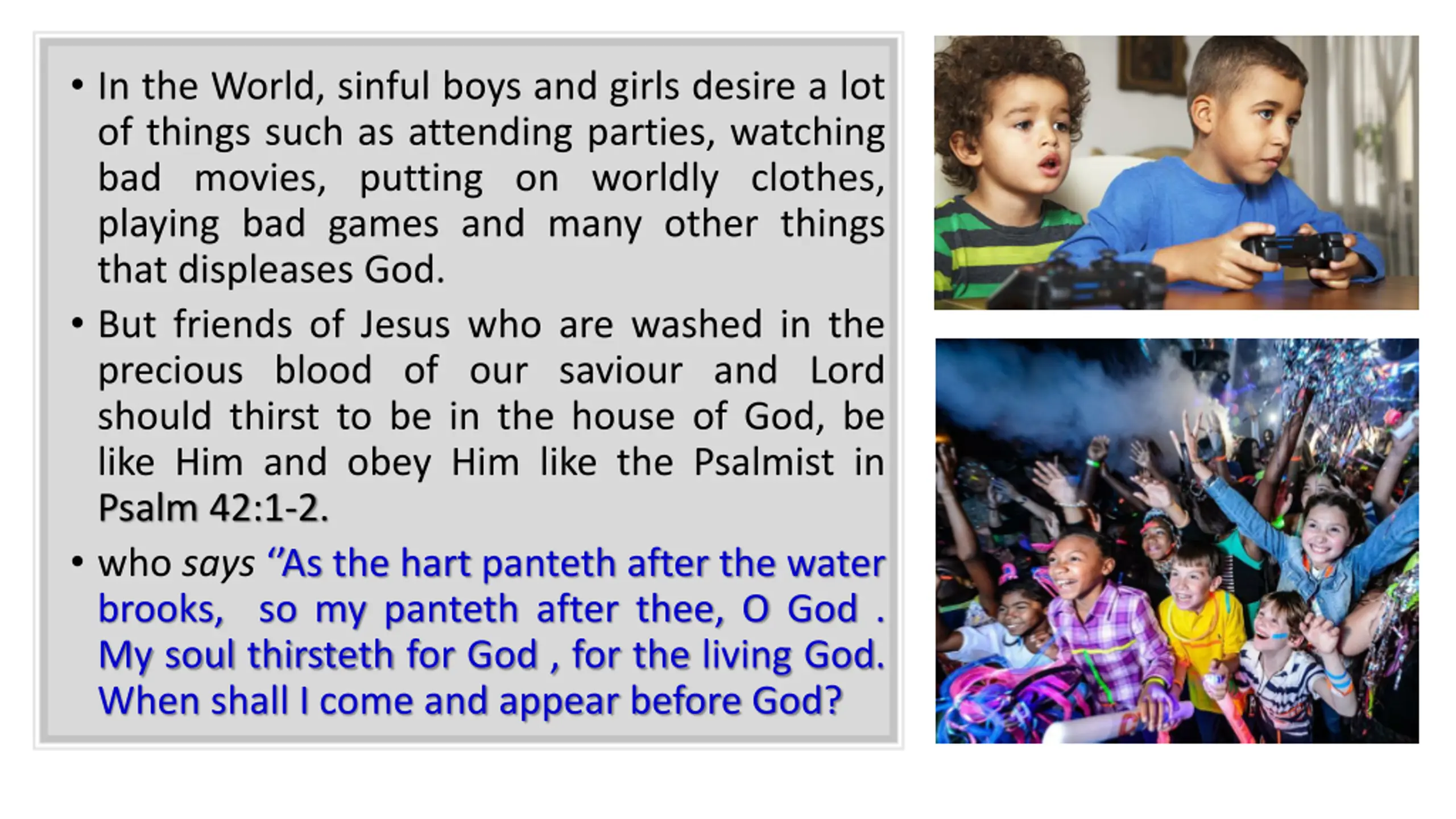 In the World, sinful boys and girls desire a lot of things such as attending parties, watching bad movies, putting on worldly clothes, playing bad games and many other things that displeases God. But friends of Jesus who are washed in the precious blood of our saviour and Lord should thirst to be in the house of God, be like Him and obey Him like the Psalmist in Psalm 42:1-2. who says As the hart panteth after the water brooks, so my panteth after thee, O God . My soul thirsteth for God , for the living God. When shall I come and appear before God?
