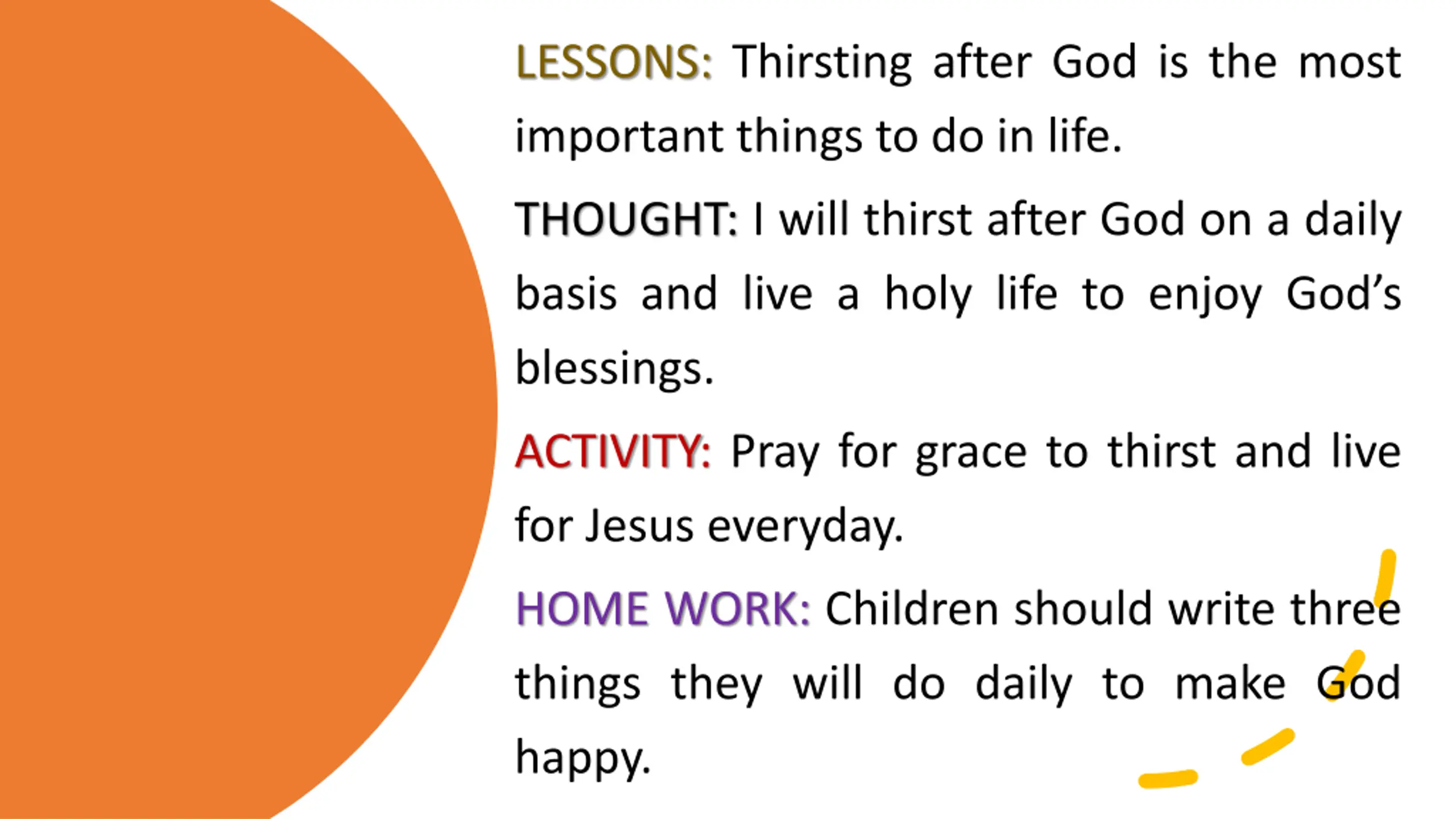 LESSONS: Thirsting after God is the most important things to do in life. THOUGHT: I will thirst after God on a daily basis and live a holy life to enjoy God s blessings. ACTIVITY: Pray for grace to thirst and live for Jesus everyday. HOME WORK: Children should write three things they will do daily to make God happy.