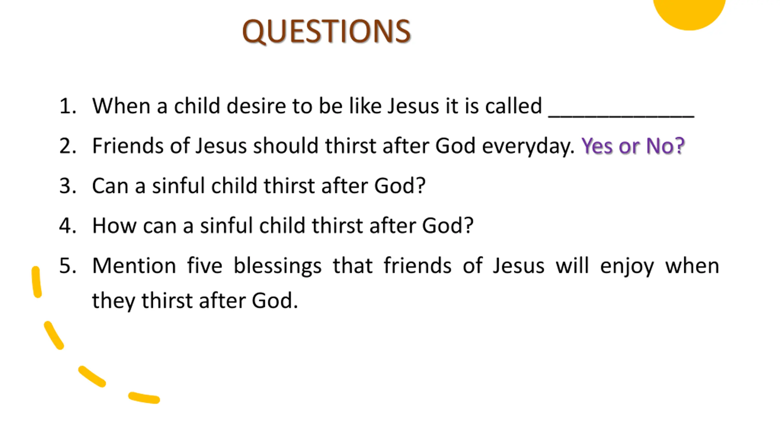 QUESTIONS 1. When a child desire to be like Jesus it is called ____________ 2. Friends of Jesus should thirst after God everyday. Yes or No? 3. Can a sinful child thirst after God? 4. How can a sinful child thirst after God? 5. Mention five blessings that friends of Jesus will enjoy when they thirst after God.