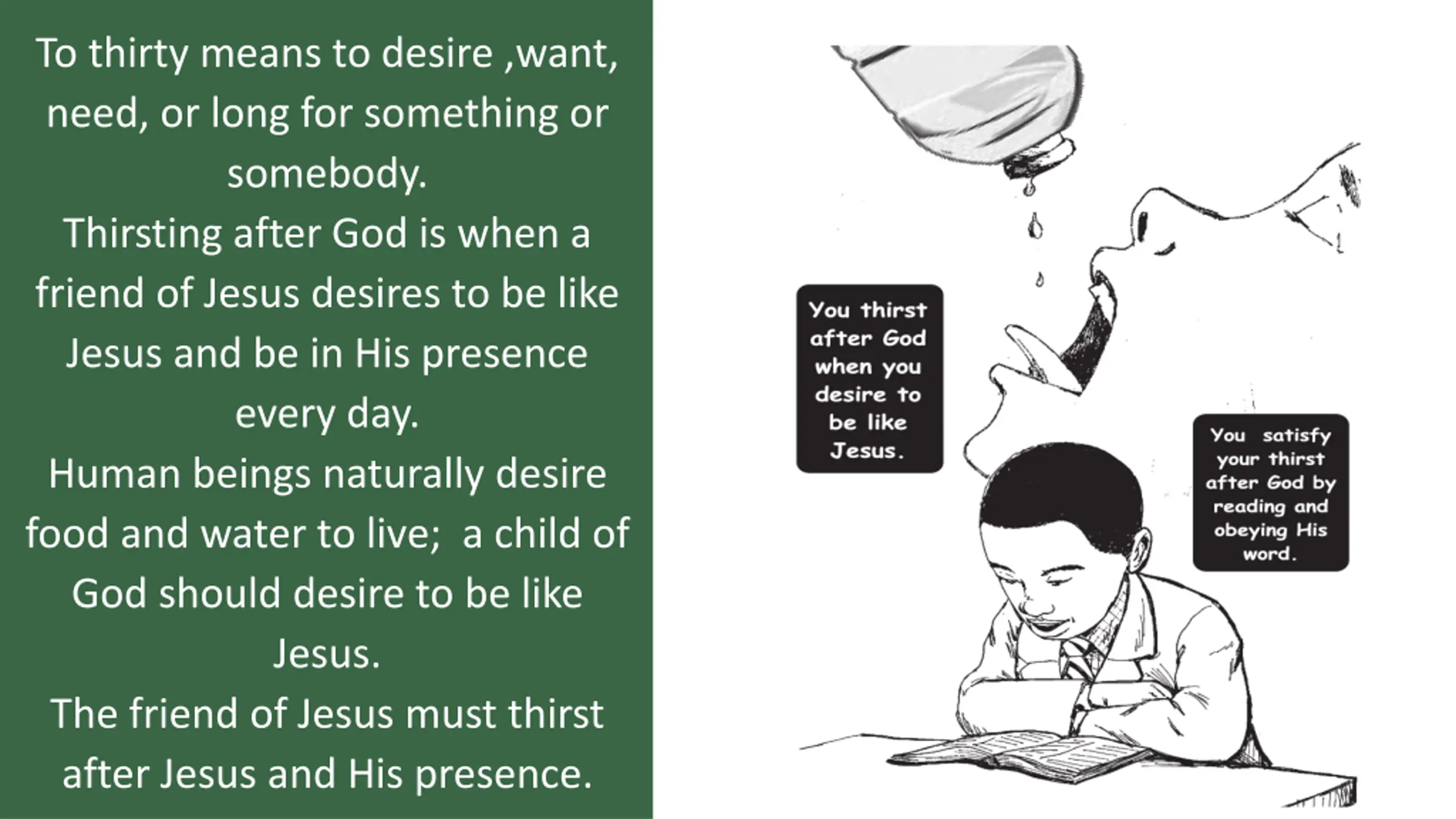 To thirty means to desire ,want, need, or long for something or somebody. Thirsting after God is when a friend of Jesus desires to be like Jesus and be in His presence every day. Human beings naturally desire food and water to live; a child of God should desire to be like Jesus. The friend of Jesus must thirst after Jesus and His presence.
