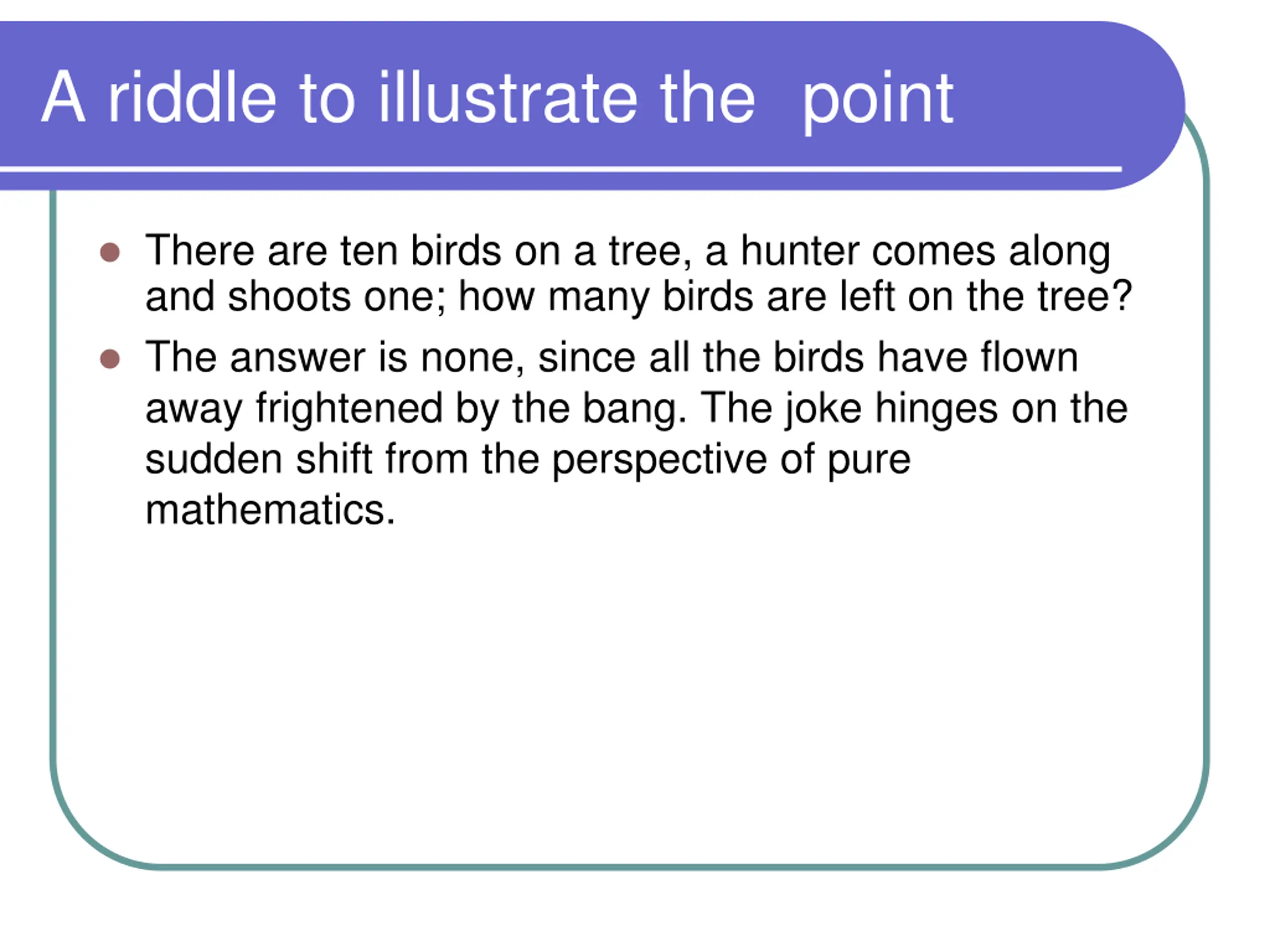 A riddle to illustrate the point There are ten birds on a tree, a hunter comes along and shoots one; how many birds are left on the tree? The answer is none, since all the birds have flown away frightened by the bang. The joke hinges on the sudden shift from the perspective of pure mathematics.