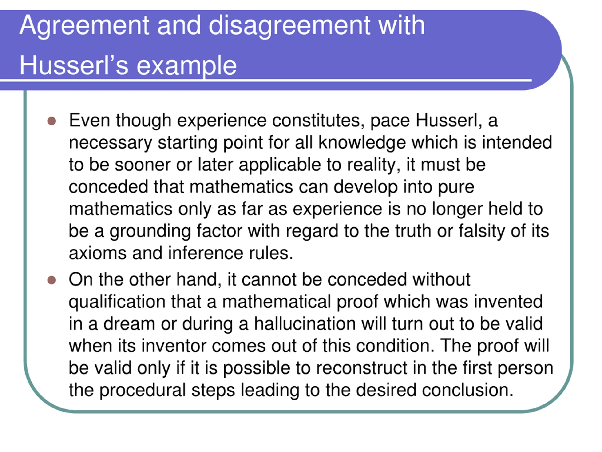 Agreement and disagreement with Husserl s example Even though experience constitutes, pace Husserl, a necessary starting point for all knowledge which is intended to be sooner or later applicable to reality, it must be conceded that mathematics can develop into pure mathematics only as far as experience is no longer held to be a grounding factor with regard to the truth or falsity of its axioms and inference rules. On the other hand, it cannot be conceded without qualification that a mathematical proof which was invented in a dream or during a hallucination will turn out to be valid when its inventor comes out of this condition. The proof will be valid only if it is possible to reconstruct in the first person the procedural steps leading to the desired conclusion.