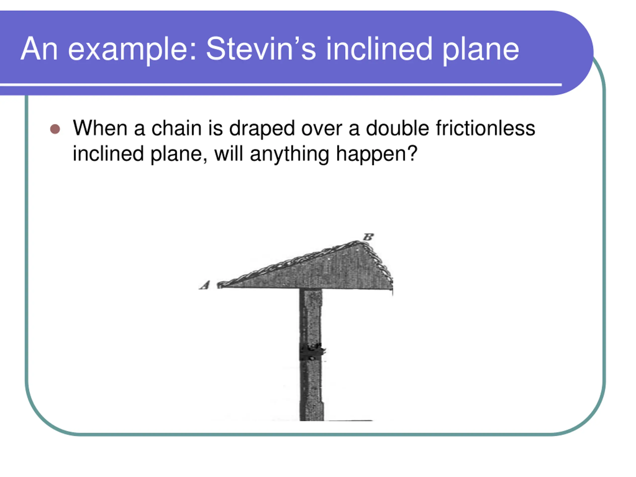 An example: Stevins inclined plane When a chain is draped over a double frictionless inclined plane, will anything happen?