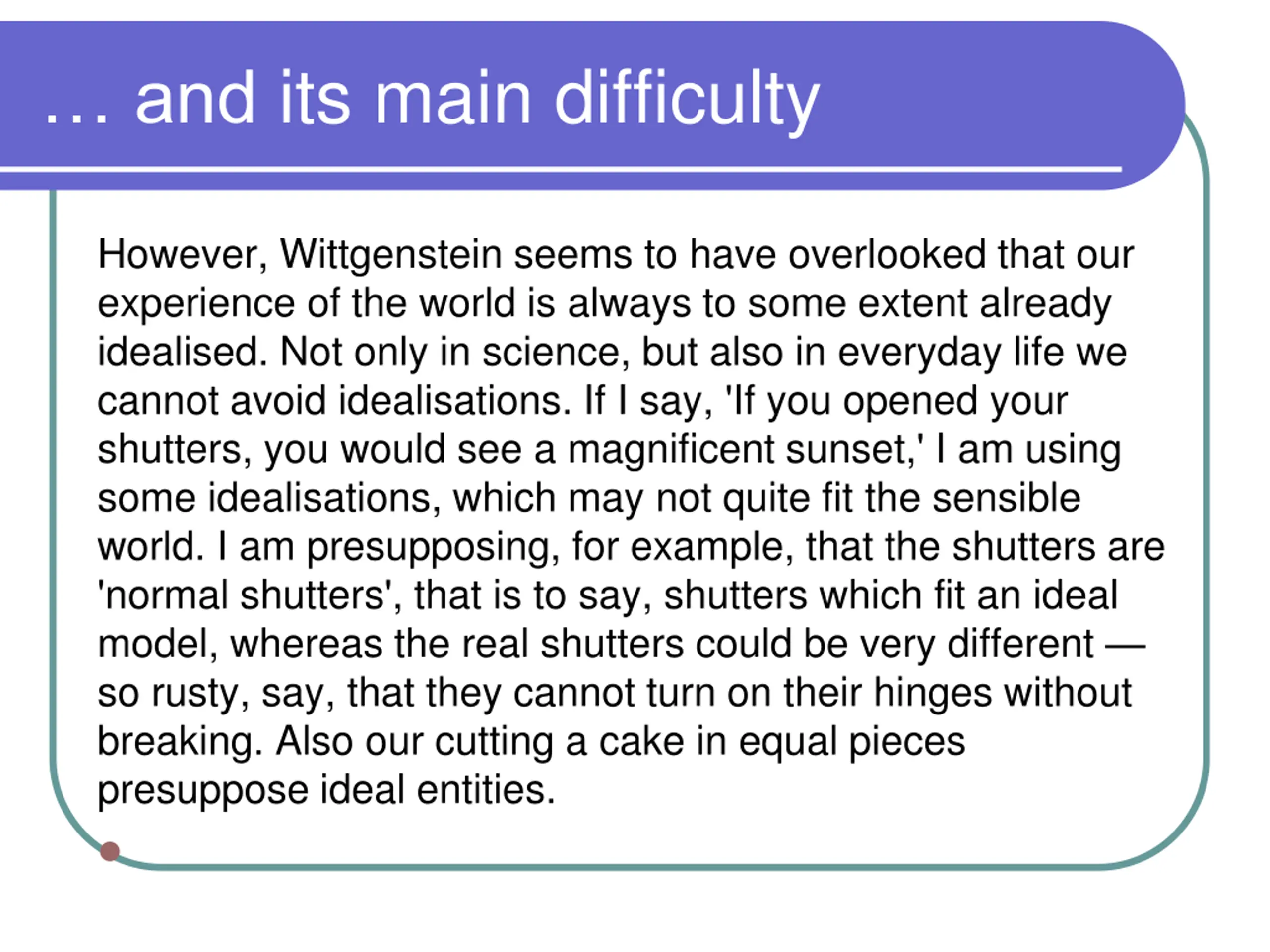 and its main difficulty However, Wittgenstein seems to have overlooked that our experience of the world is always to some extent already idealised. Not only in science, but also in everyday life we cannot avoid idealisations. If I say, 'If you opened your shutters, you would see a magnificent sunset,' I am using some idealisations, which may not quite fit the sensible world. I am presupposing, for example, that the shutters are 'normal shutters', that is to say, shutters which fit an ideal model, whereas the real shutters could be very different so rusty, say, that they cannot turn on their hinges without breaking. Also our cutting a cake in equal pieces presuppose ideal entities.