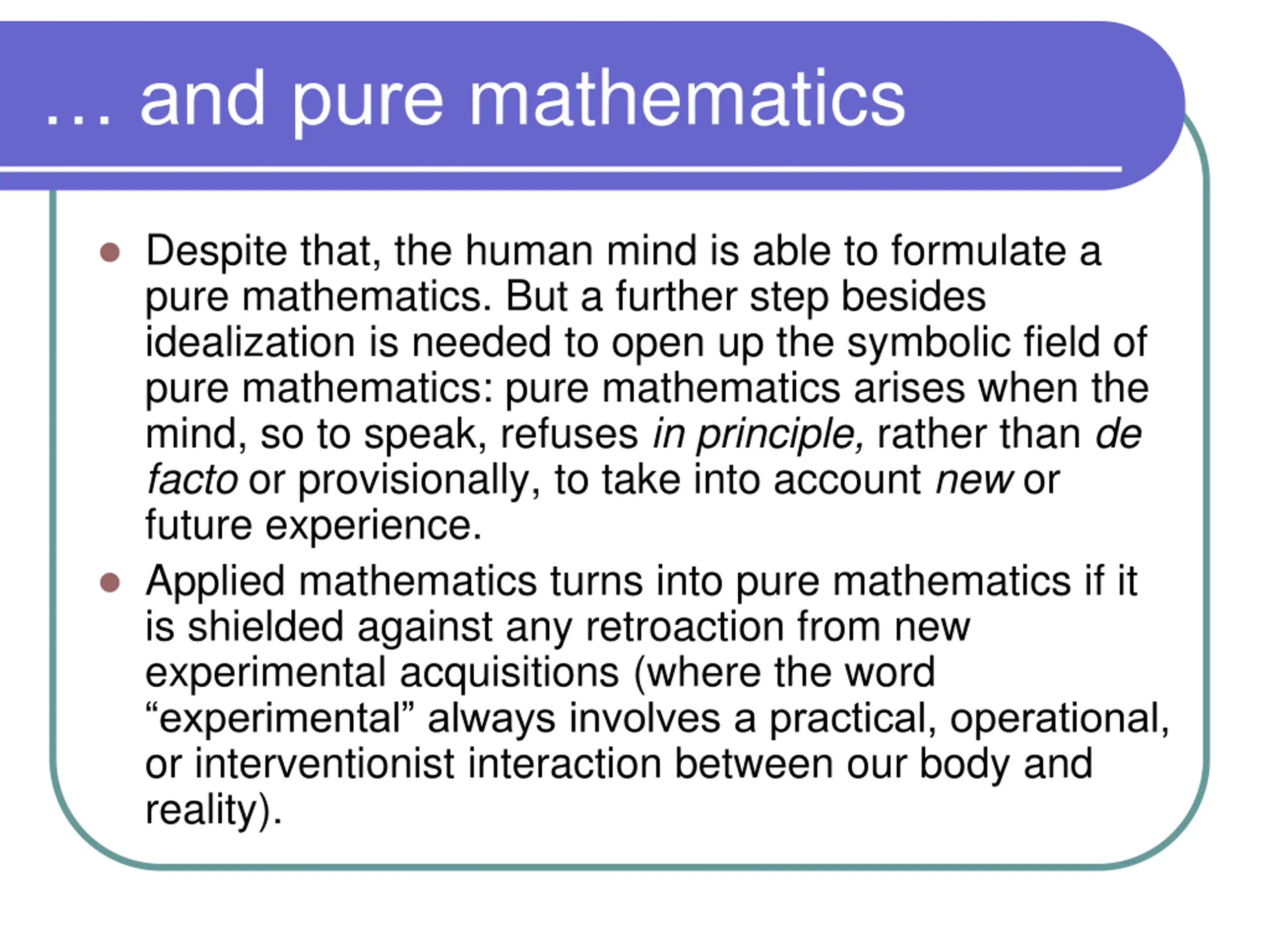 and pure mathematics Despite that, the human mind is able to formulate a pure mathematics. But a further step besides idealization is needed to open up the symbolic field of pure mathematics: pure mathematics arises when the mind, so to speak, refuses in principle, rather than de facto or provisionally, to take into account new or future experience. Applied mathematics turns into pure mathematics if it is shielded against any retroaction from new experimental acquisitions (where the word experimental always involves a practical, operational, or interventionist interaction between our body and reality).