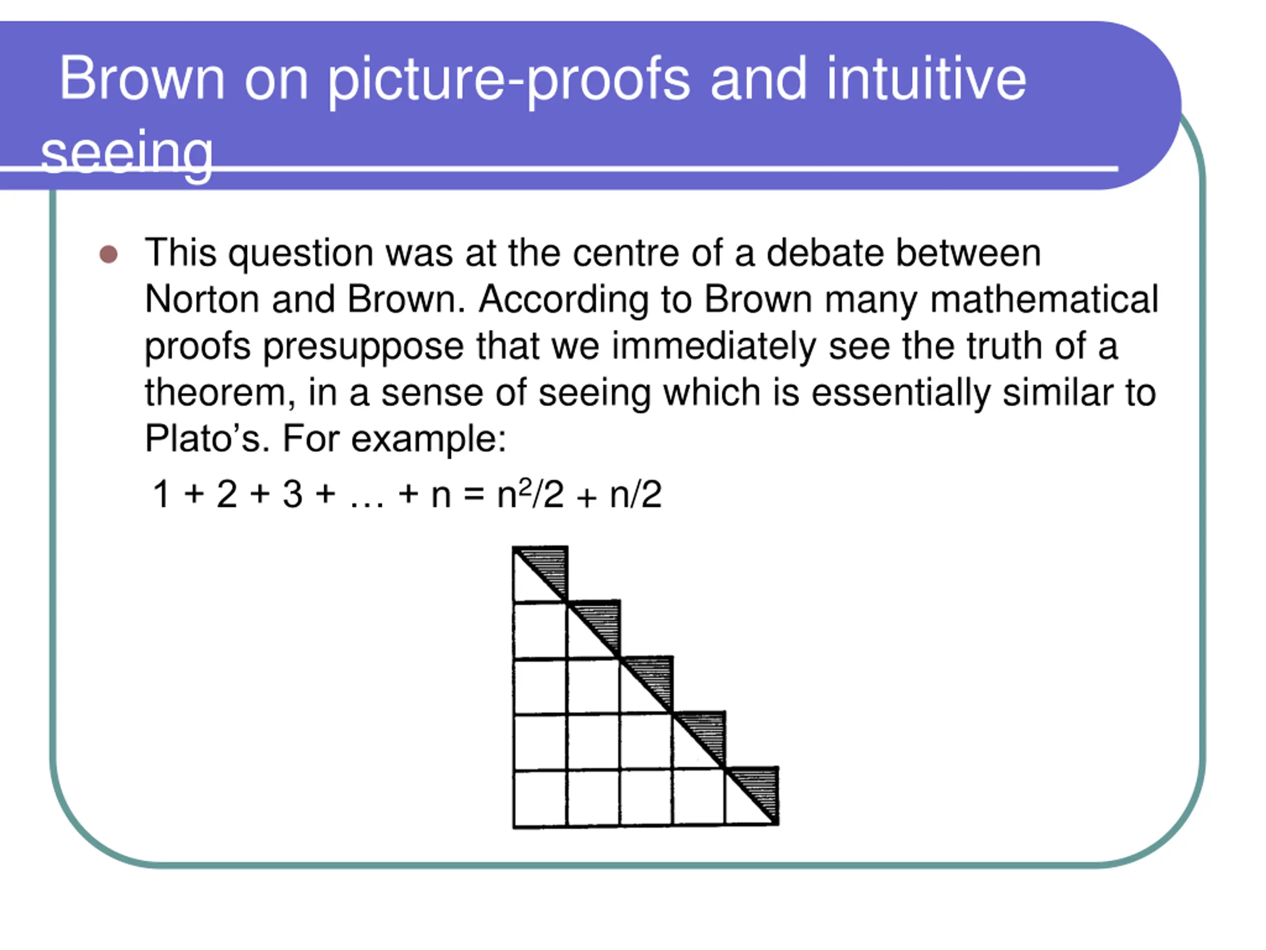 Brown on picture-proofs and intuitive seeing This question was at the centre of a debate between Norton and Brown. According to Brown many mathematical proofs presuppose that we immediately see the truth of a theorem, in a sense of seeing which is essentially similar to Plato s. For example: 1 + 2 + 3 + + n = n2/2 + n/2