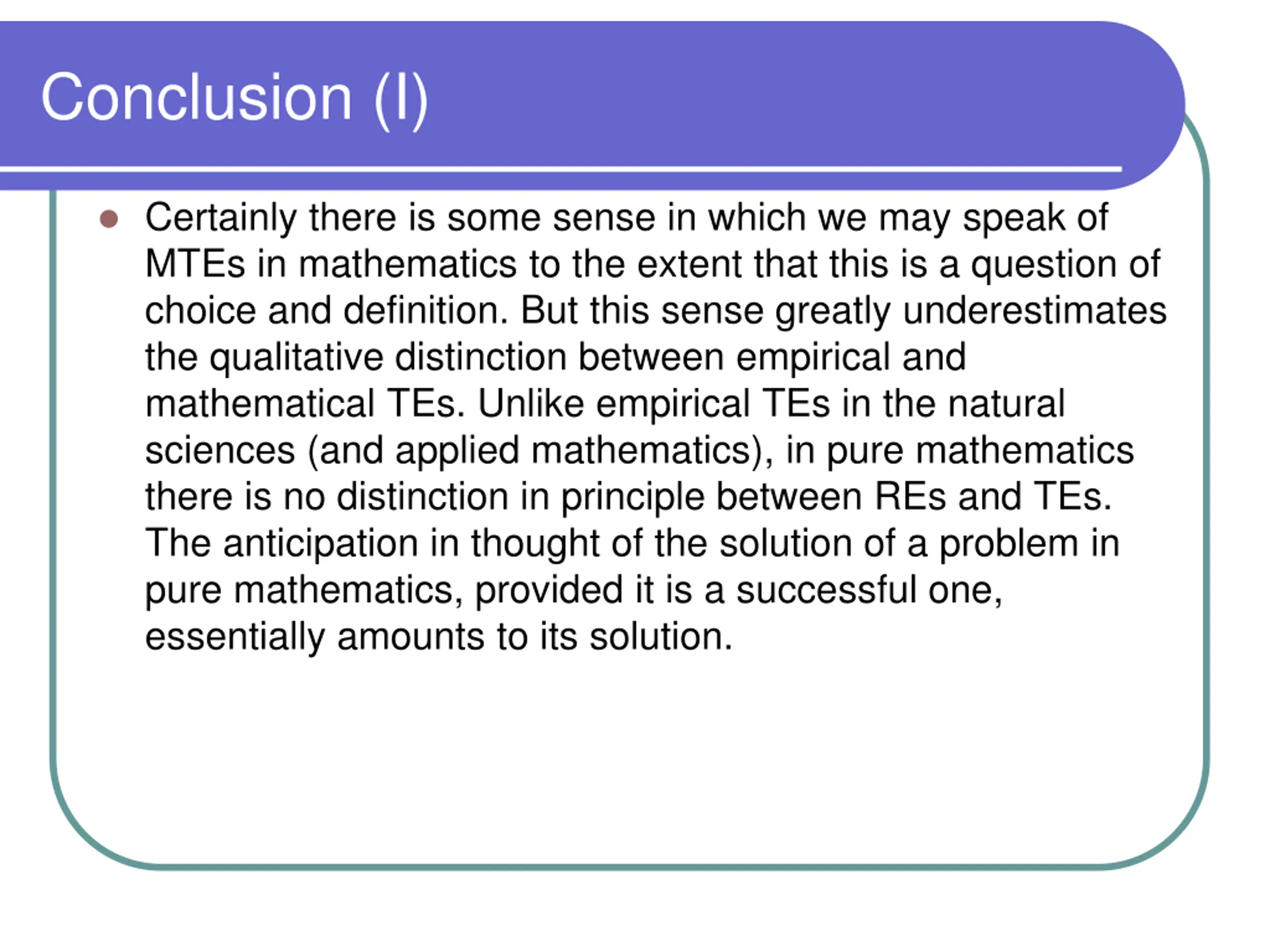 Conclusion (I) Certainly there is some sense in which we may speak of MTEs in mathematics to the extent that this is a question of choice and definition. But this sense greatly underestimates the qualitative distinction between empirical and mathematical TEs. Unlike empirical TEs in the natural sciences (and applied mathematics), in pure mathematics there is no distinction in principle between REs and TEs. The anticipation in thought of the solution of a problem in pure mathematics, provided it is a successful one, essentially amounts to its solution.