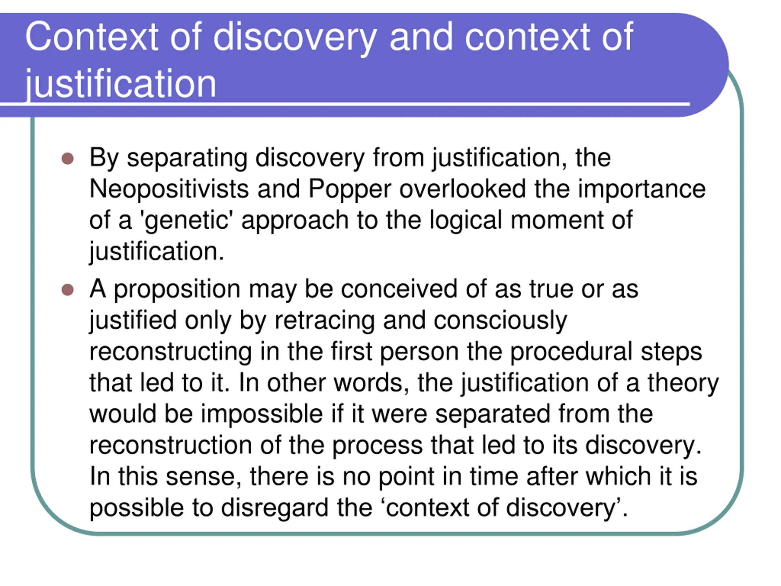 Context of discovery and context of justification By separating discovery from justification, the Neopositivists and Popper overlooked the importance of a 'genetic' approach to the logical moment of justification. A proposition may be conceived of as true or as justified only by retracing and consciously reconstructing in the first person the procedural steps that led to it. In other words, the justification of a theory would be impossible if it were separated from the reconstruction of the process that led to its discovery. In this sense, there is no point in time after which it is possible to disregard the context of discovery .