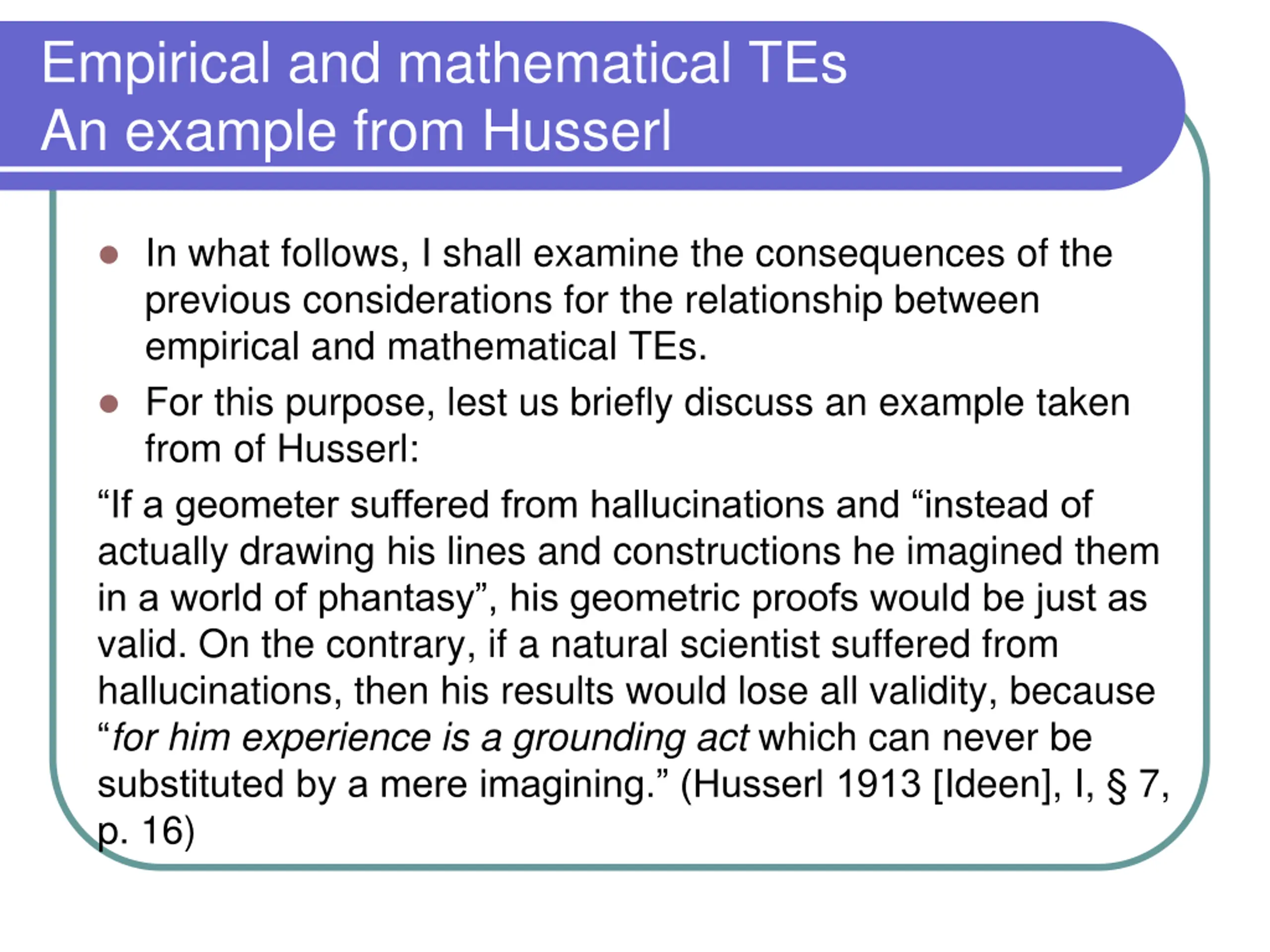 Empirical and mathematical TEs An example from Husserl In what follows, I shall examine the consequences of the previous considerations for the relationship between empirical and mathematical TEs. For this purpose, lest us briefly discuss an example taken from of Husserl: If a geometer suffered from hallucinations and instead of actually drawing his lines and constructions he imagined them in a world of phantasy , his geometric proofs would be just as valid. On the contrary, if a natural scientist suffered from hallucinations, then his results would lose all validity, because for him experience is a grounding act which can never be substituted by a mere imagining. (Husserl 1913 [Ideen], I, 7, p. 16)