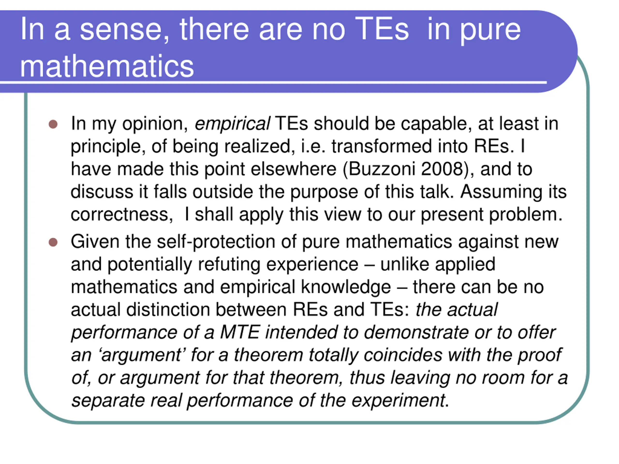 In a sense, there are no TEs in pure mathematics In my opinion, empirical TEs should be capable, at least in principle, of being realized, i.e. transformed into REs. I have made this point elsewhere (Buzzoni 2008), and to discuss it falls outside the purpose of this talk. Assuming its correctness, I shall apply this view to our present problem. Given the self-protection of pure mathematics against new and potentially refuting experience unlike applied mathematics and empirical knowledge there can be no actual distinction between REs and TEs: the actual performance of a MTE intended to demonstrate or to offer an argument for a theorem totally coincides with the proof of, or argument for that theorem, thus leaving no room for a separate real performance of the experiment.
