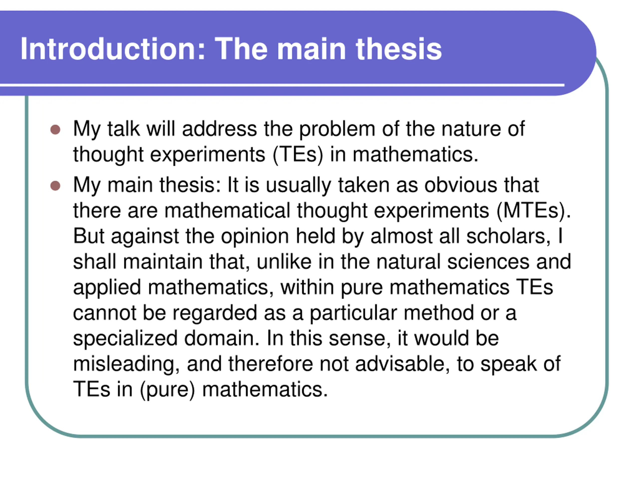 Introduction: The main thesis My talk will address the problem of the nature of thought experiments (TEs) in mathematics. My main thesis: It is usually taken as obvious that there are mathematical thought experiments (MTEs). But against the opinion held by almost all scholars, I shall maintain that, unlike in the natural sciences and applied mathematics, within pure mathematics TEs cannot be regarded as a particular method or a specialized domain. In this sense, it would be misleading, and therefore not advisable, to speak of TEs in (pure) mathematics.