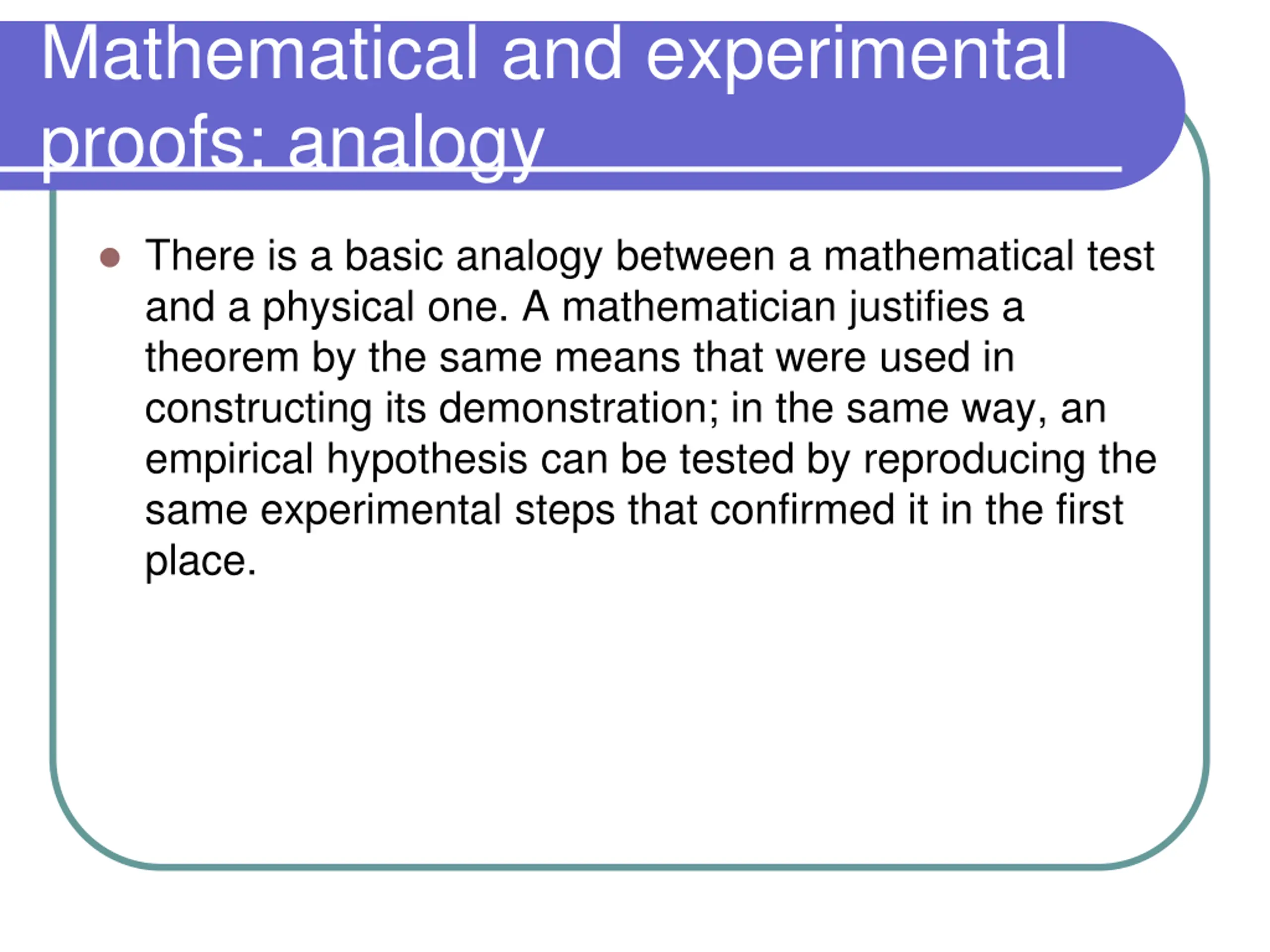 Mathematical and experimental proofs: analogy There is a basic analogy between a mathematical test and a physical one. A mathematician justifies a theorem by the same means that were used in constructing its demonstration; in the same way, an empirical hypothesis can be tested by reproducing the same experimental steps that confirmed it in the first place.