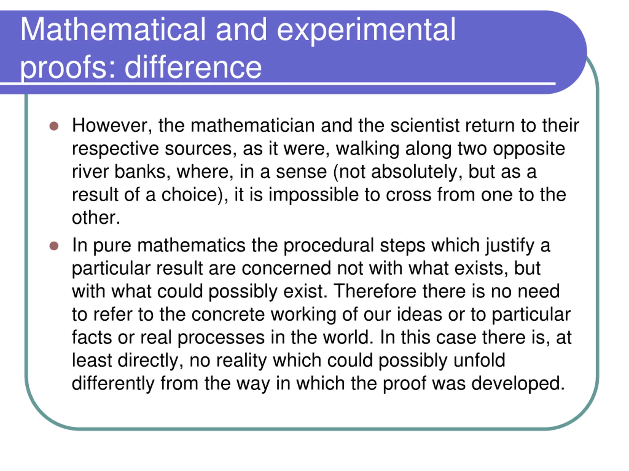 Mathematical and experimental proofs: difference However, the mathematician and the scientist return to their respective sources, as it were, walking along two opposite river banks, where, in a sense (not absolutely, but as a result of a choice), it is impossible to cross from one to the other. In pure mathematics the procedural steps which justify a particular result are concerned not with what exists, but with what could possibly exist. Therefore there is no need to refer to the concrete working of our ideas or to particular facts or real processes in the world. In this case there is, at least directly, no reality which could possibly unfold differently from the way in which the proof was developed.
