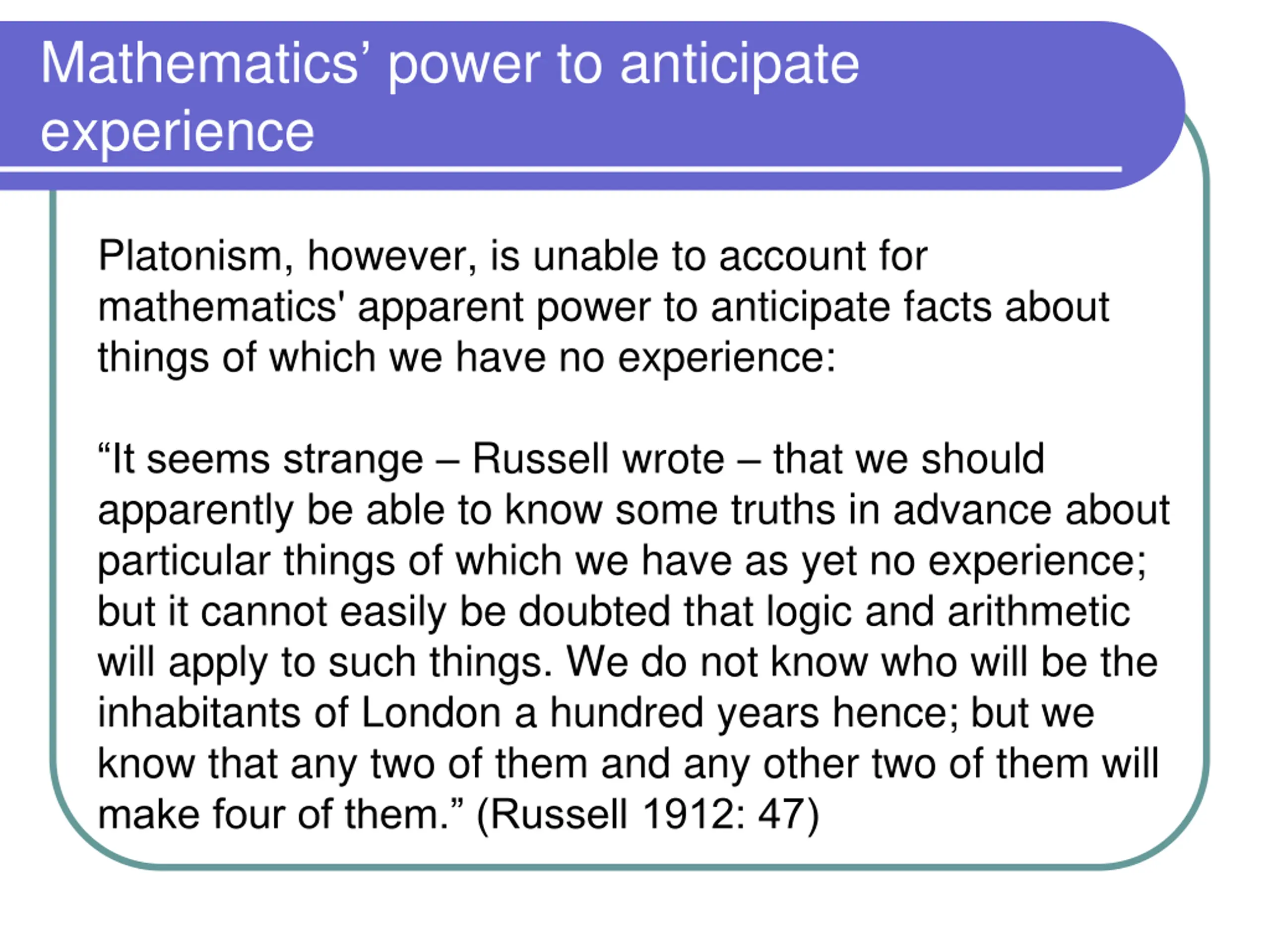 Mathematics power to anticipate experience Platonism, however, is unable to account for mathematics' apparent power to anticipate facts about things of which we have no experience: It seems strange Russell wrote that we should apparently be able to know some truths in advance about particular things of which we have as yet no experience; but it cannot easily be doubted that logic and arithmetic will apply to such things. We do not know who will be the inhabitants of London a hundred years hence; but we know that any two of them and any other two of them will make four of them. (Russell 1912: 47)