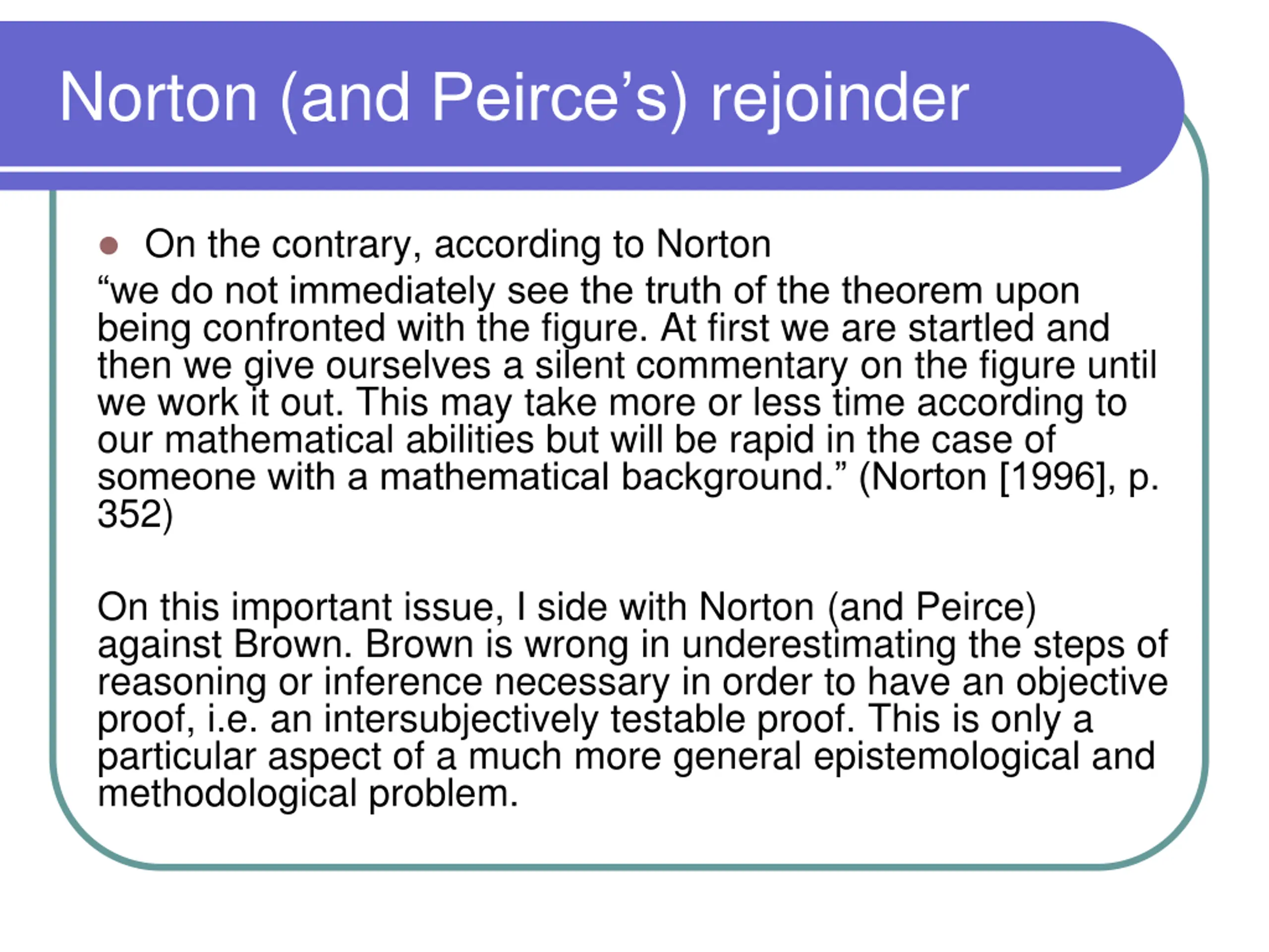 Norton (and Peirces) rejoinder On the contrary, according to Norton we do not immediately see the truth of the theorem upon being confronted with the figure. At first we are startled and then we give ourselves a silent commentary on the figure until we work it out. This may take more or less time according to our mathematical abilities but will be rapid in the case of someone with a mathematical background. (Norton [1996], p. 352) On this important issue, I side with Norton (and Peirce) against Brown. Brown is wrong in underestimating the steps of reasoning or inference necessary in order to have an objective proof, i.e. an intersubjectively testable proof. This is only a particular aspect of a much more general epistemological and methodological problem.